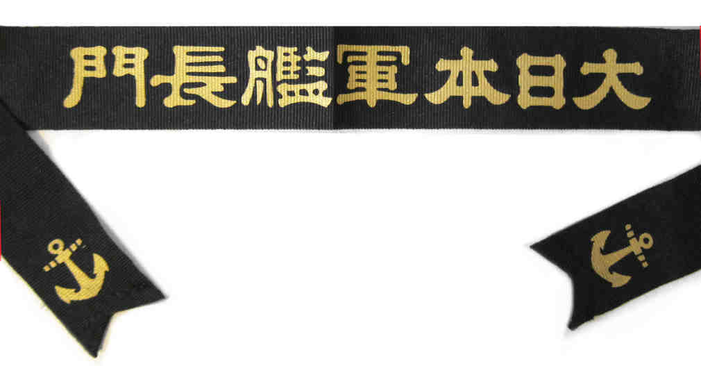 Reproduction WW2 Japanese Navy Ratings cap tally. This reads 'Great Japan Nagato' from right to left which means it was used prior to 1941 after this the 'Great Japan Imperial Navy' tallies were used to reduce the chance of ships being identified by the allies.
