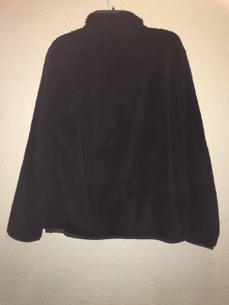 American Eagle black with royal blue details faux fur jacket. The hem sleeves are stretch. This has zip side zip pockets zips all the way up the neck with single zip chest pocket.