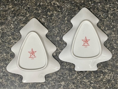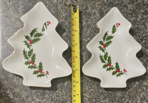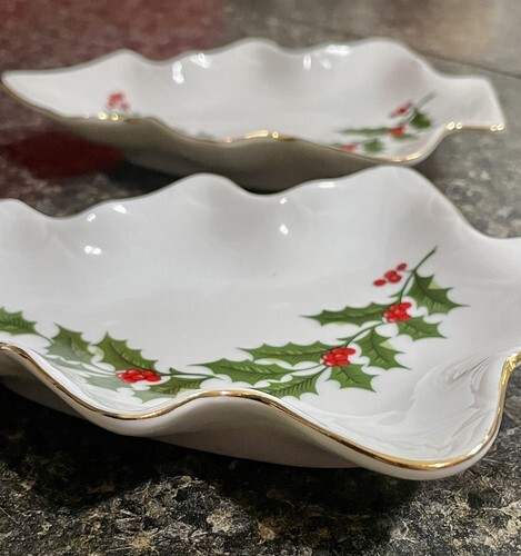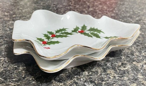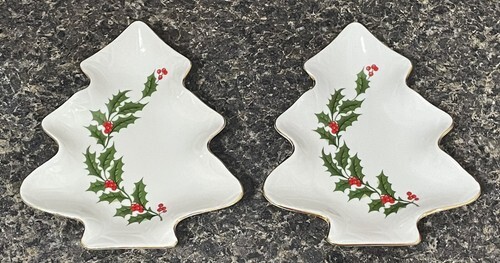 PAIR All The Trimmings Porcelain Gold Rimmed Holly Tree Trinket Candy Dish Japan