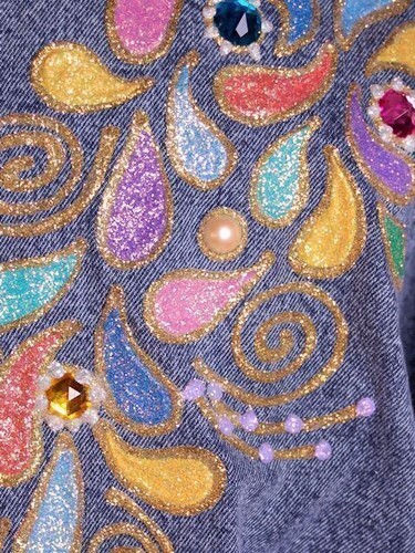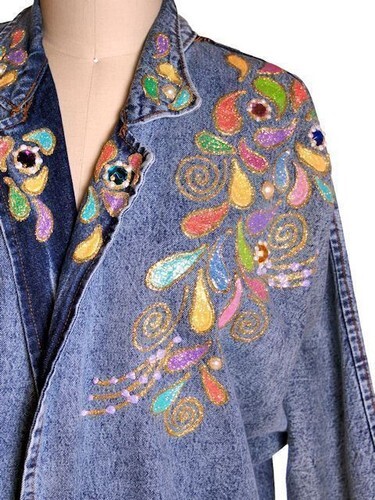 VTG 1980s Laura Rogers Acid Wash Painted Denim Embellished Jacket Sz S–XL