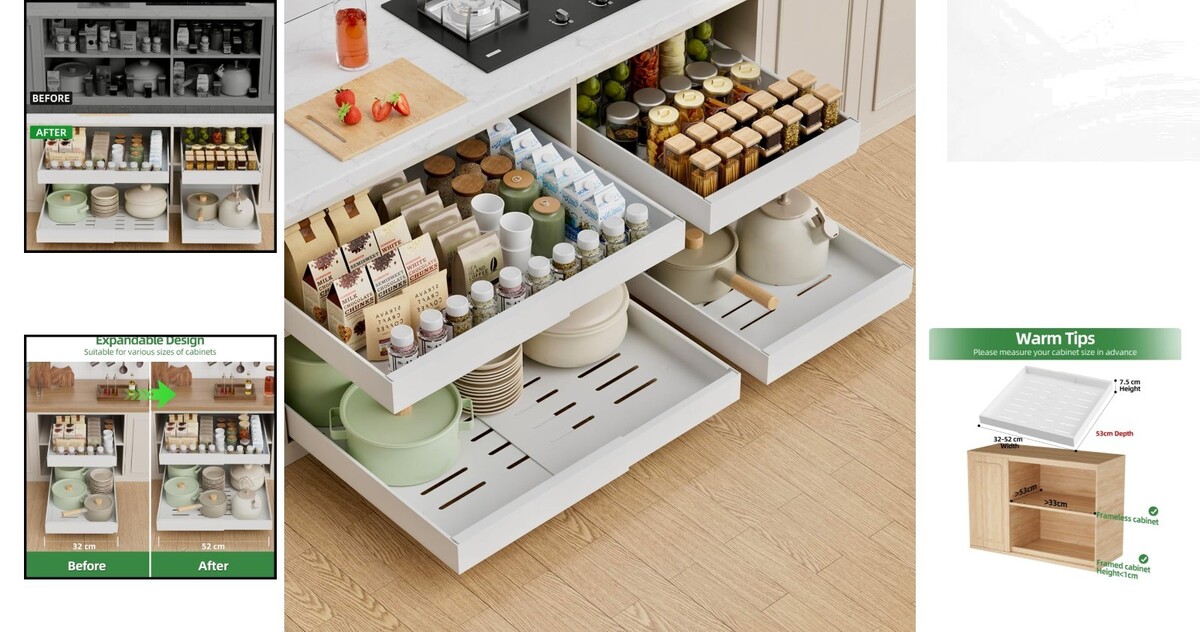 4 Pack Expandable Pull Out Cabinet Organizer - 21'' Deep, Easy Installation