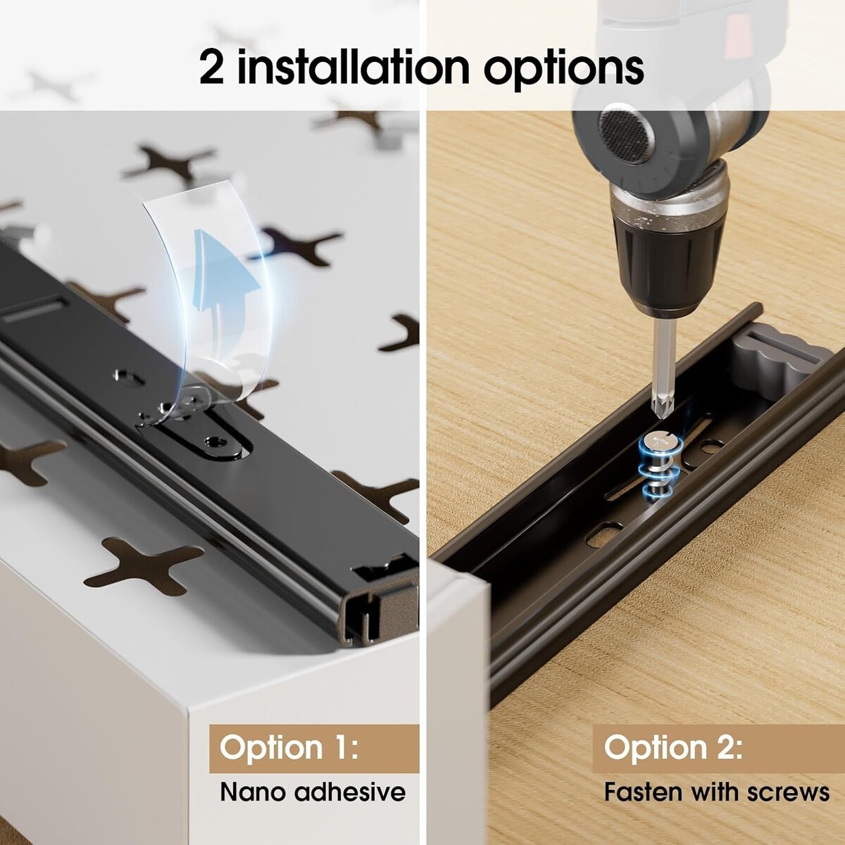 User-Friendly Installation: Choose between pre-installed slides with peel-and-stick nano adhesive for quick assembly or screws for added sturdiness, ensuring a customized fit for your kitchen drawers.