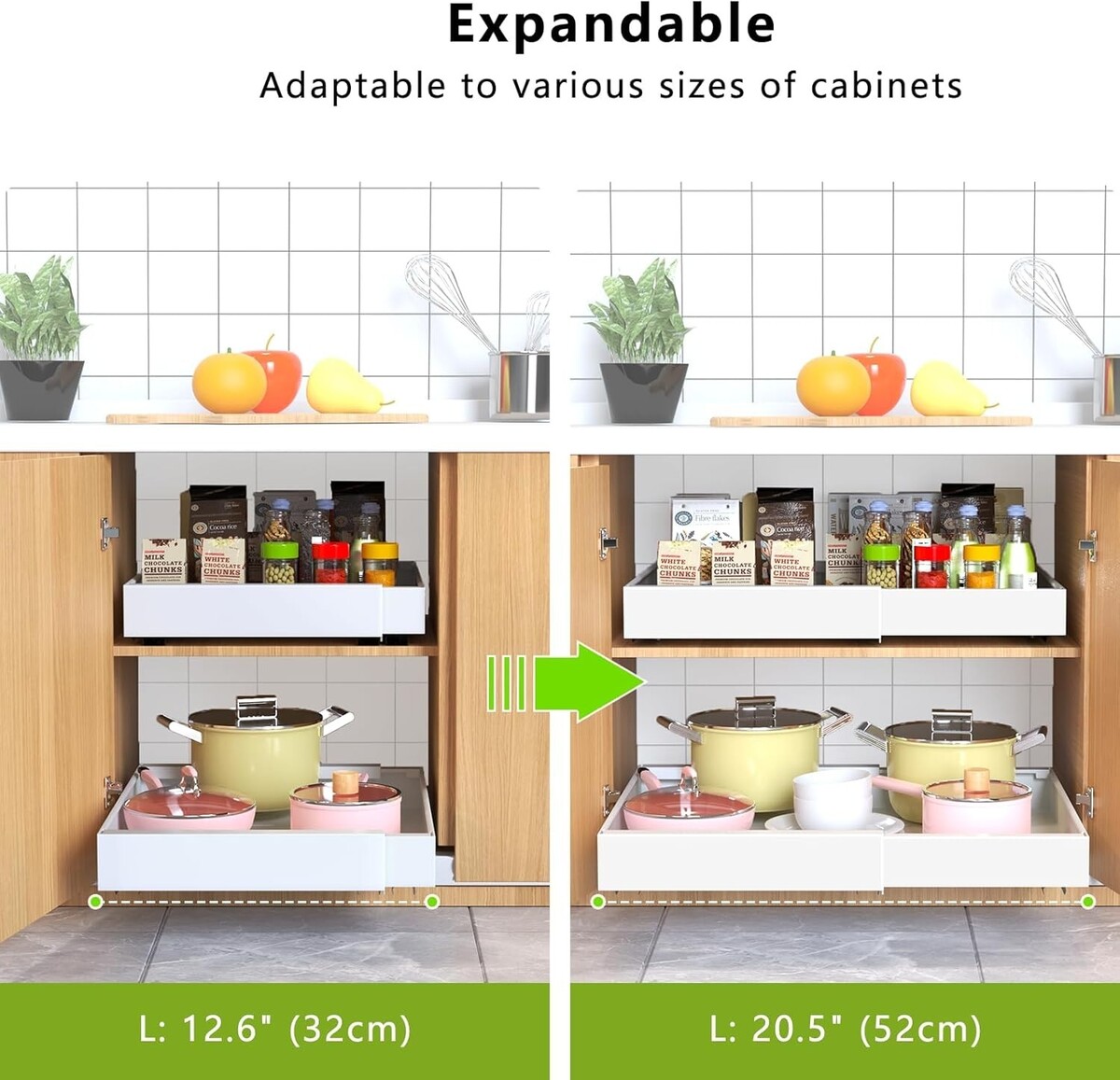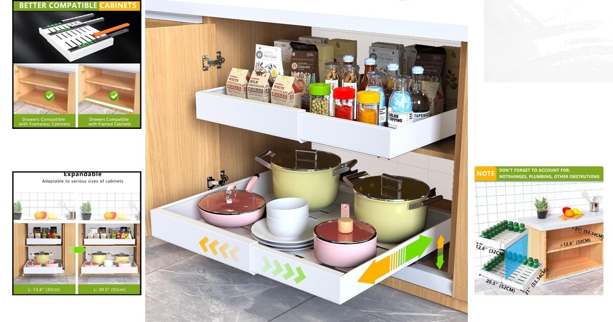 21" Deep Pull-Out Drawer Organizer - Adjustable Width, Durable Metal, 2 Pack