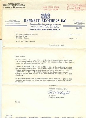 Bennett Brothers Jewelers Letter & Envelope Chicago Illinois 1958