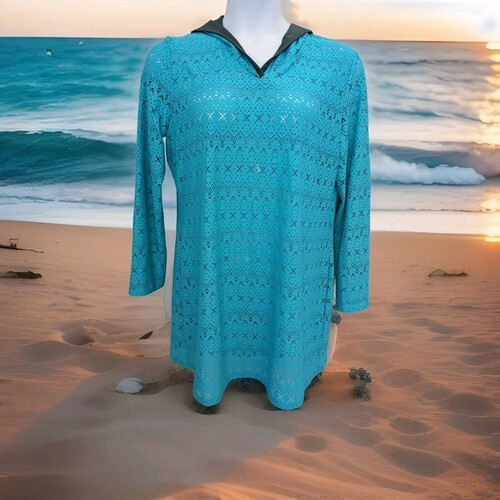 Title Nine Laser Cut Tunic Swim Beach Cover Up Hooded Lined Teal Dress Sz XL. Condition is Pre-owned. Shipped with USPS Ground Advantage.