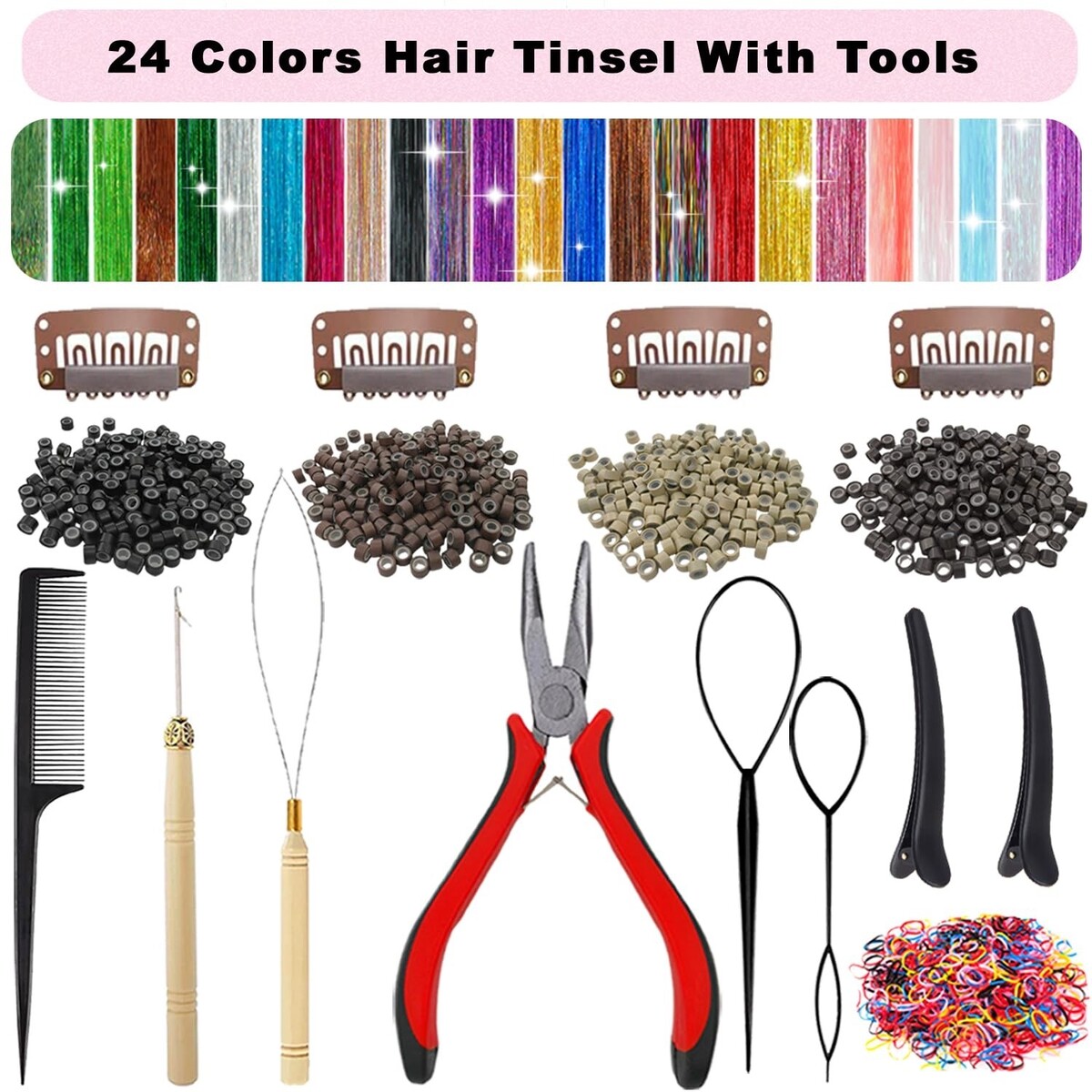 Hair Tinsel Kit Includes: 24 vibrant colors 9800 strands of shimmering hair tinsel, 1 plier, 1 crochet hook, 1 threader, 4 colors micro silicone link rings beads (black, brown, dark brown and blonde), 2 ponytail hoop tools, 2 hair clips, 4 wig clips, 1 rat tail comb and colorful rubber bands