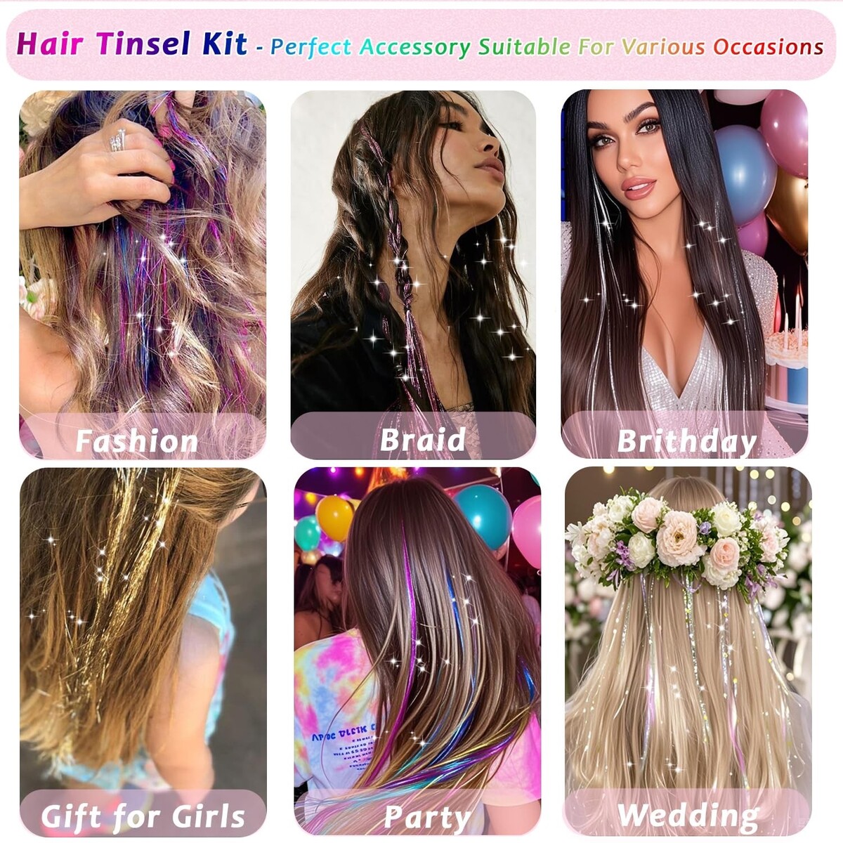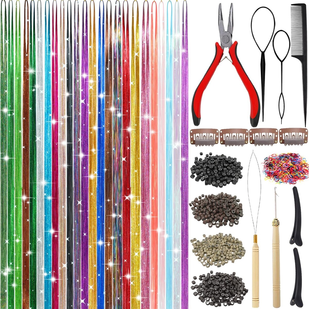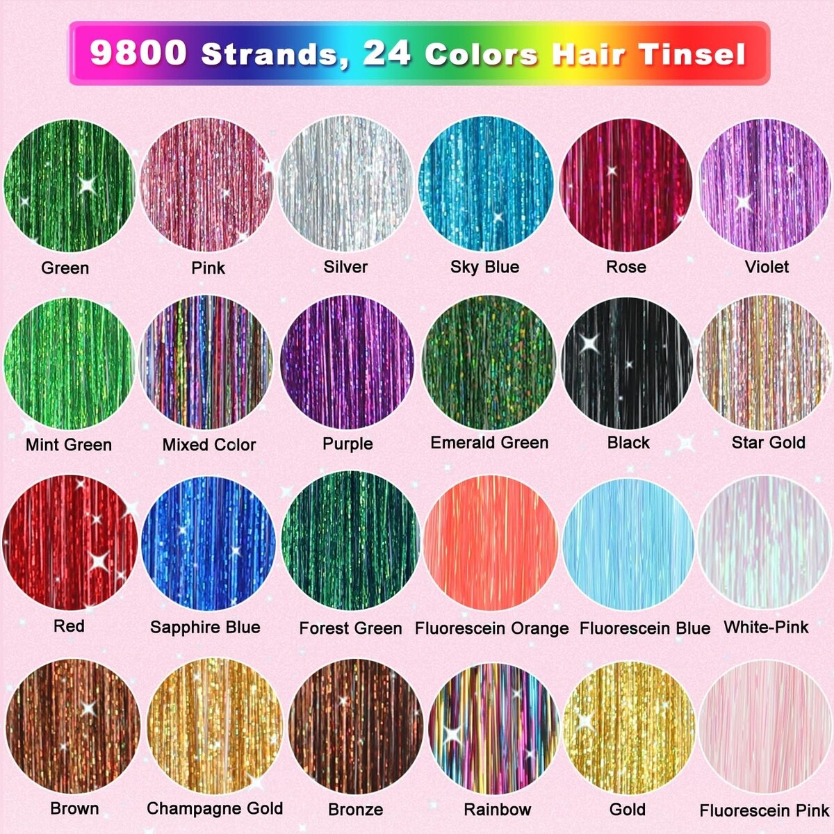 24-Color Hair Tinsel Kit 9800 Strands & Tools for Festive Hair Extensions 48 in