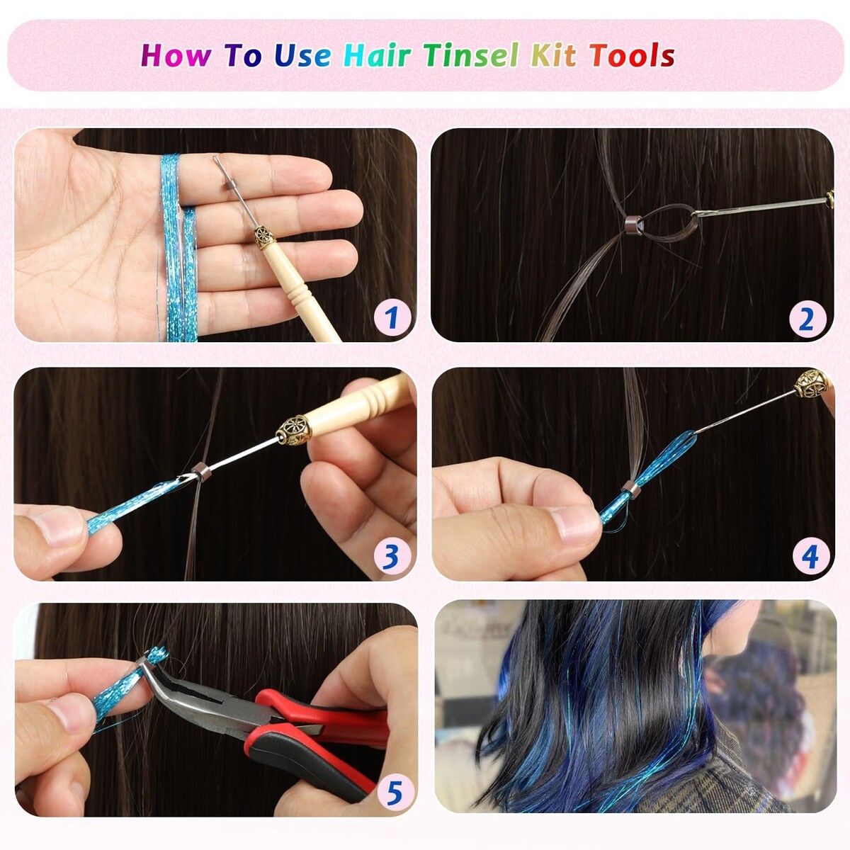 Easy Application: This hair tinsel kit with all the tools needed, simple to attach and remove without damaging natural hair, allowing for quick style changes whenever desired. 48 inches in length, allowing for customization to match any hair length