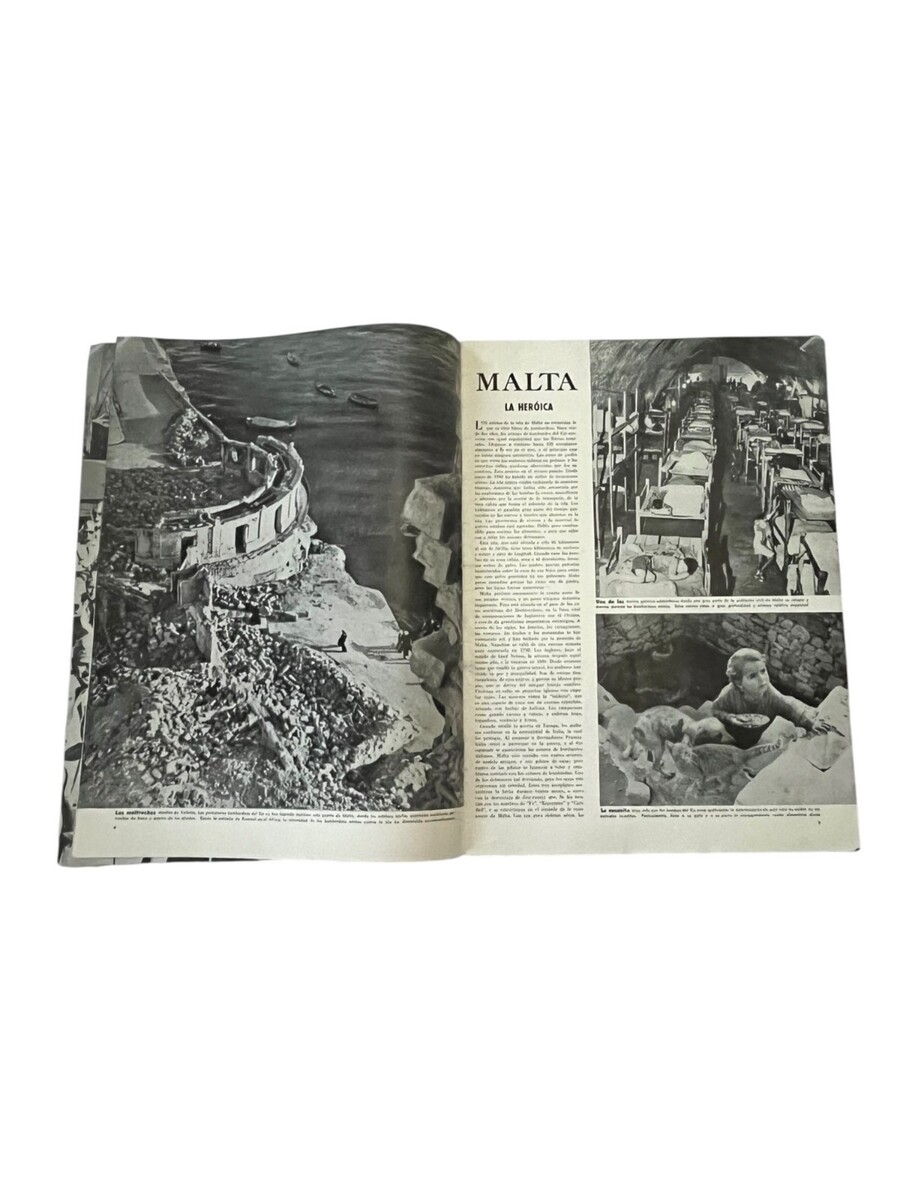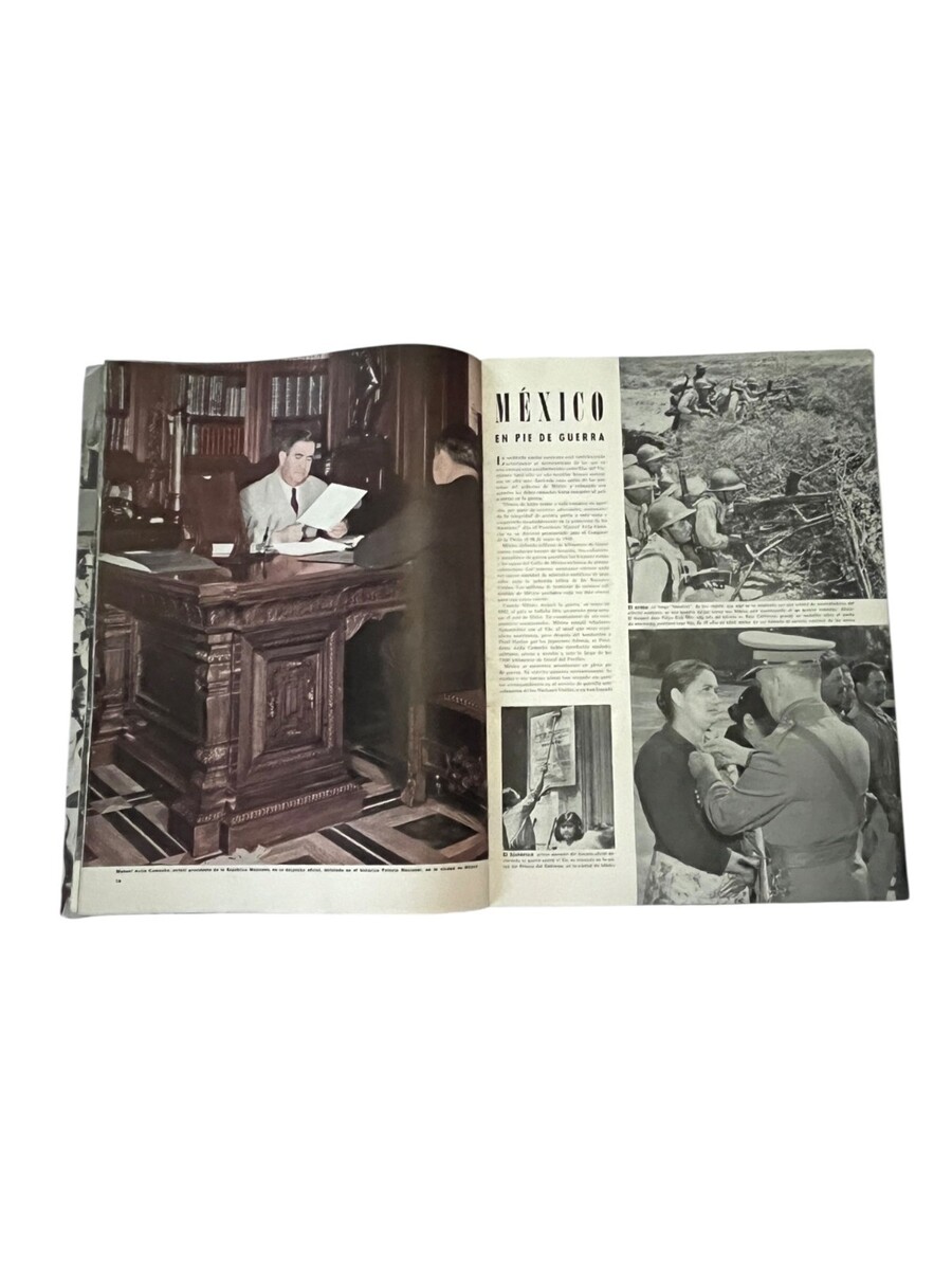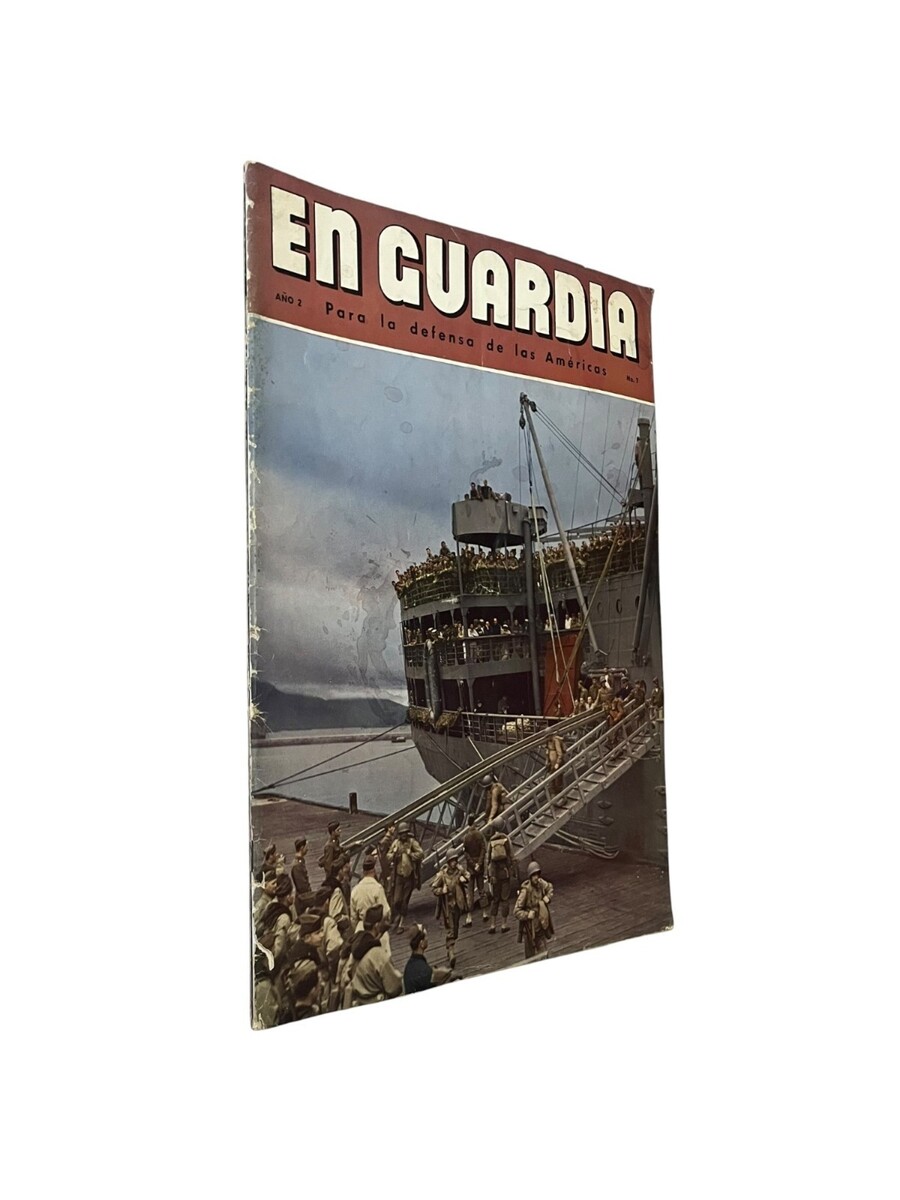 Original vintage En Guardia magazine, Spanish-language WWII era publication featuring military and global defense topics. Includes period photography and articles such as Malta, Mexico en pie de guerra, and naval base construction. Illustrated throughout with black and white and color images.