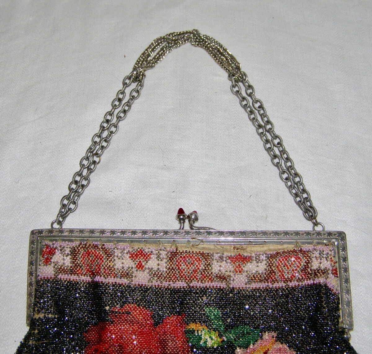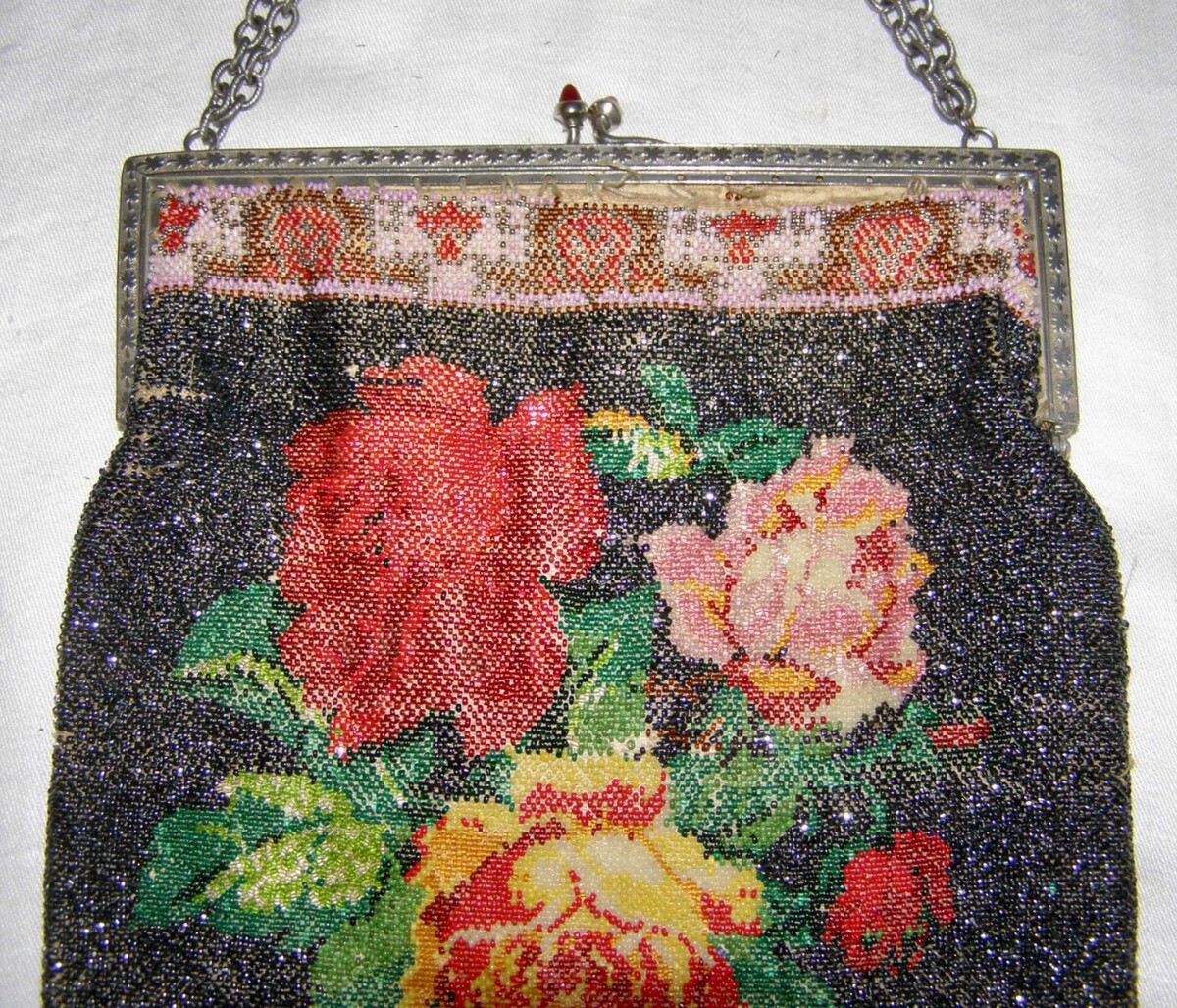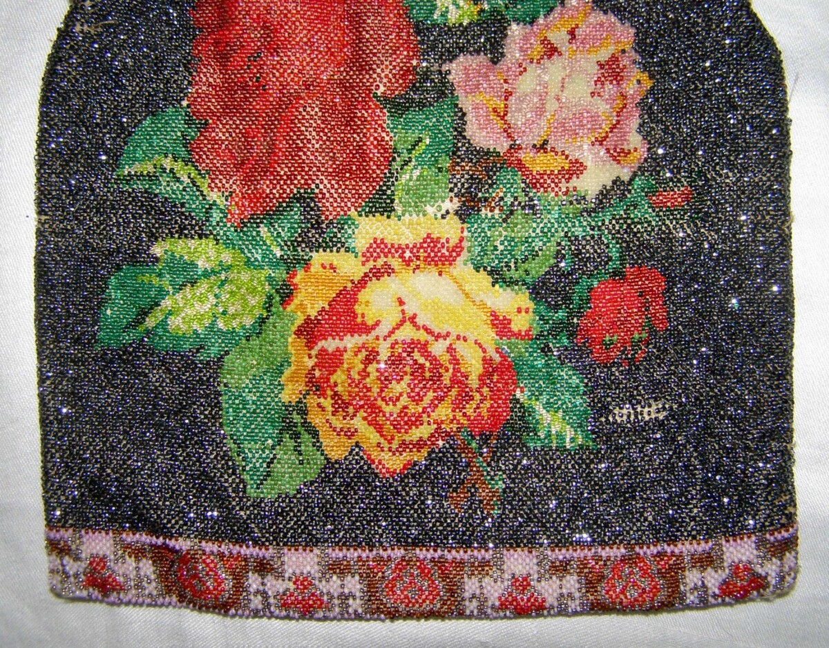 VINT. LATE 1930’s BEADED HANDBAG- MICRO-MINI BEADS - ROSES ON METALIC BLACK-MED.