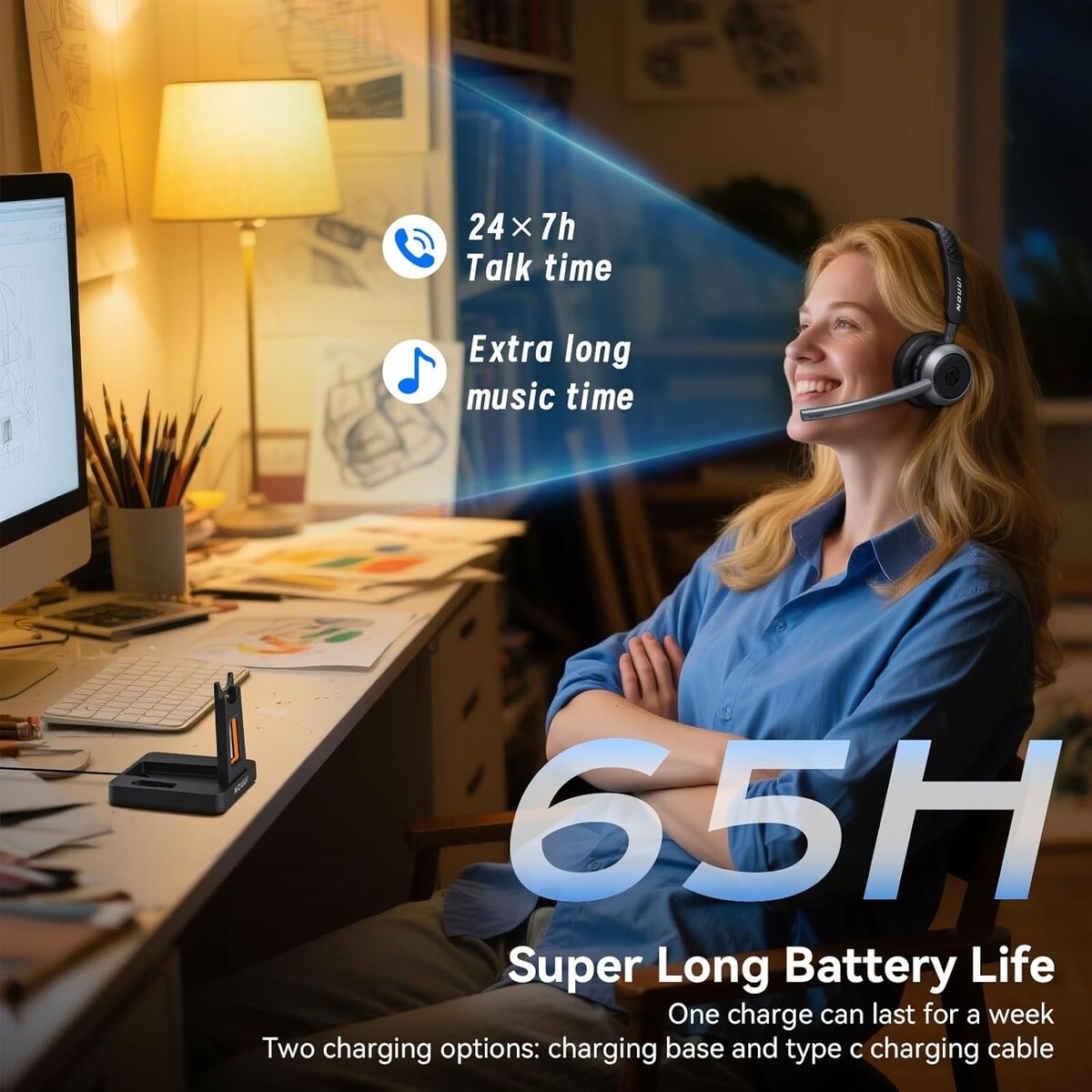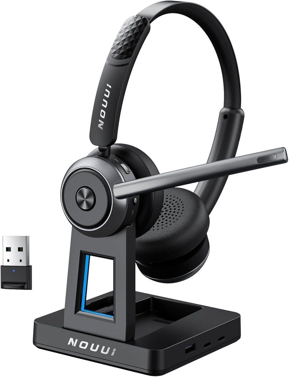 65-Hour Battery Life for a Full Week of Work: The wireless headphones with mic for work delivers up to 65 hours on just a 2-hour charge?enough for a full week of meetings, office shifts, remote work, or travel without battery anxiety. Charge via USB-C or place the wireless headset with microphone on the base for hassle-free charging. The base of bluetooth headset with microphone includes a slot to keep dongle secure, helping you stay productive at the office, on the road, or working from home