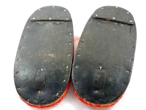 ANtique Wooden shoes with thong style straps are covered with a metallic red damask. They have a thick black leather sole nailed on showing the age. They measure about 6? long by 2 1/2? wide with a 1? platform.