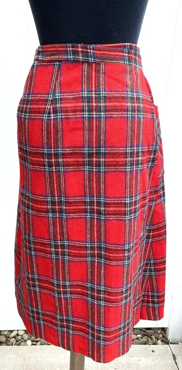 VTG 70s Mr. Stanley Red Tartan Plaid Wrap skirt School Girly Big Pockets Wool