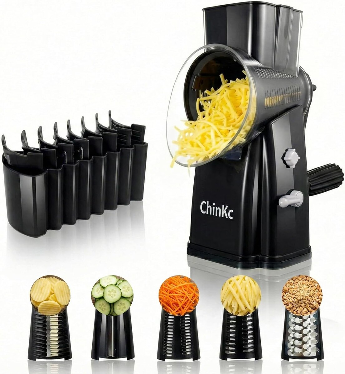 ????????? ?-??-? ?????????????: Elevate your culinary creations with our 5 in 1 rotary grater featuring 5 interchangeable blades, including precise slicing, julienne options, shredding, and weaving capabilities. From delicate julienne cuts to hearty shredding tasks, this vegetable slicer shredder offers unparalleled versatility for all your kitchen endeavors.