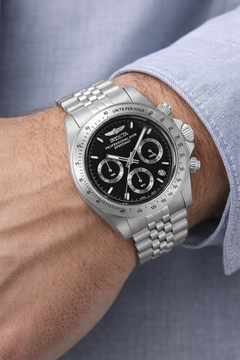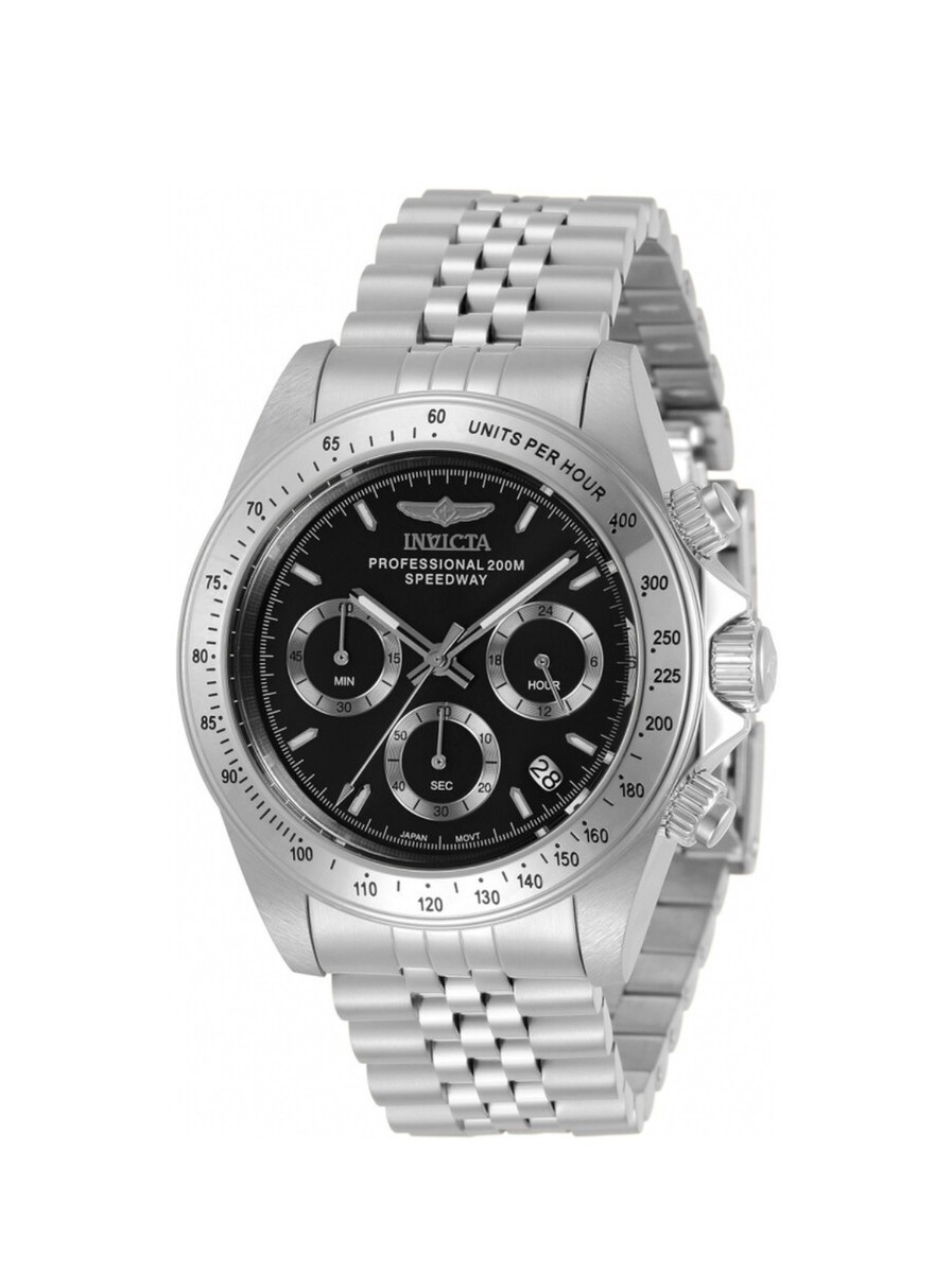 This Invicta watch from the Speedway collection with Swiss Chronograph movements, 200 meter water resistance, screw-down case backs, luminous hands.