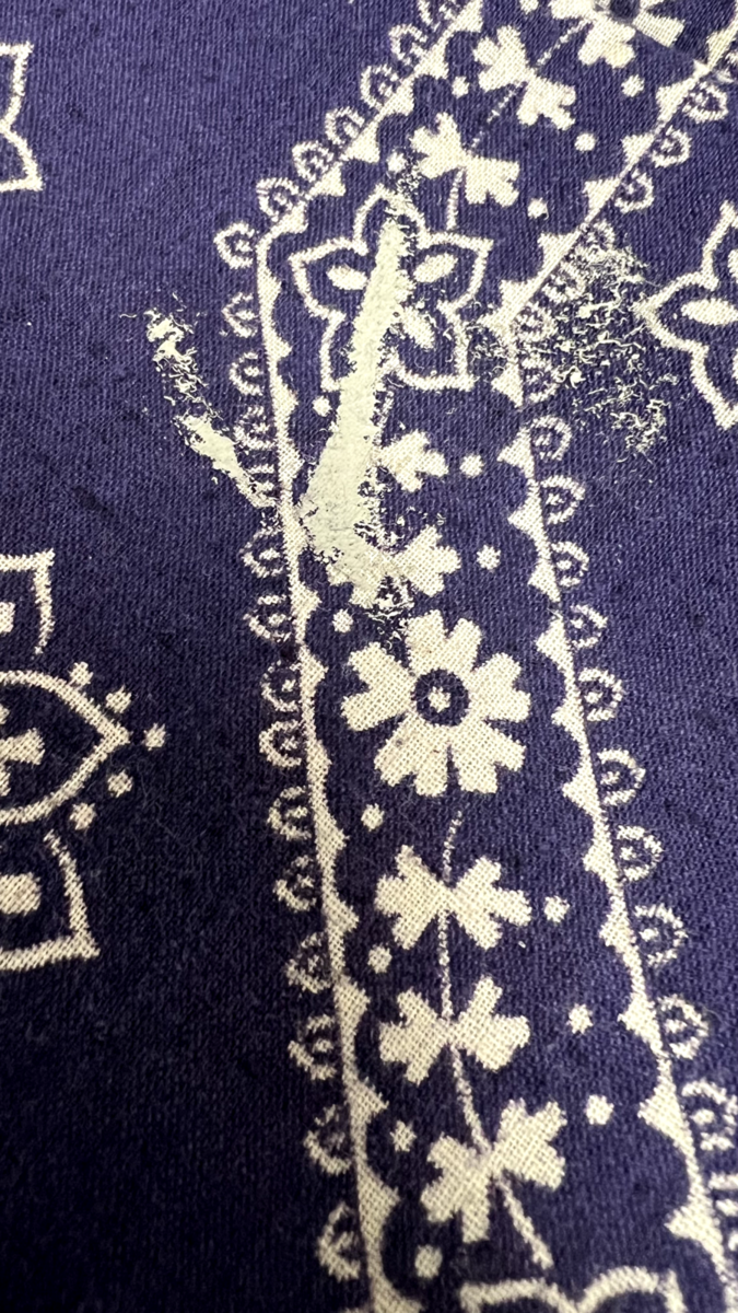 In good condition, has a tiny bit of paint, and the hem is a little ragged on one edge, but overall very good.