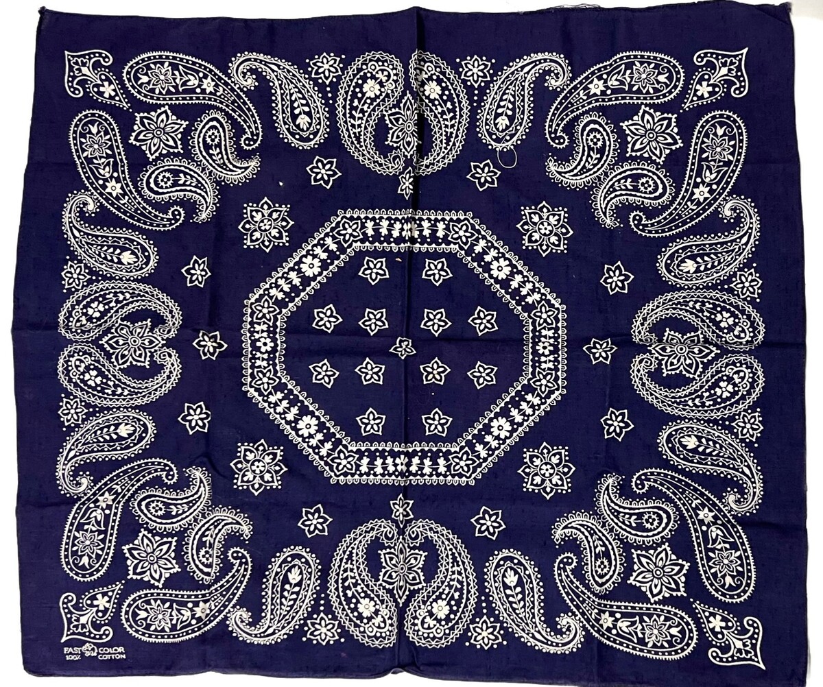 This classic Elephant Brand navy blue bandana features crisp white paisley, soft broken-in cotton, and the iconic ?elephant trunk up? logo ? a hallmark of true vintage Americana. Its selvedge edge construction and heritage feel make it a perfect addition for collectors, stylists, and costumers.