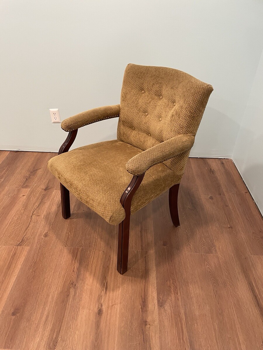 For sale is a nice wood and tan fabric chair. The chair has some very minor edge wear to a couple of arms as shown. Very solid construction.