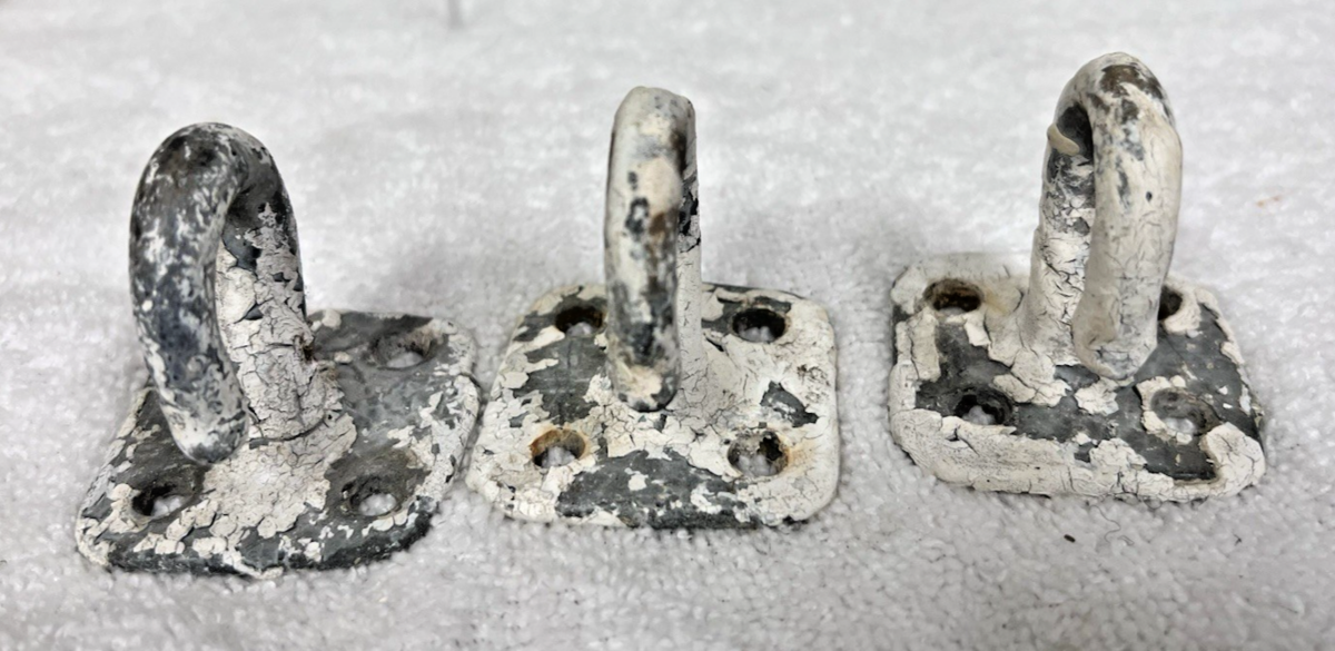 3 Vintage Distressed White Paint Cottage Core Shabby Farmhouse Wall Mount Hooks. Distressed white paint shabby wall mount brackets measure 2" square, hooks approx. 1 3/4" long and 3/8" thick. Selling as shown/found. See pictures.