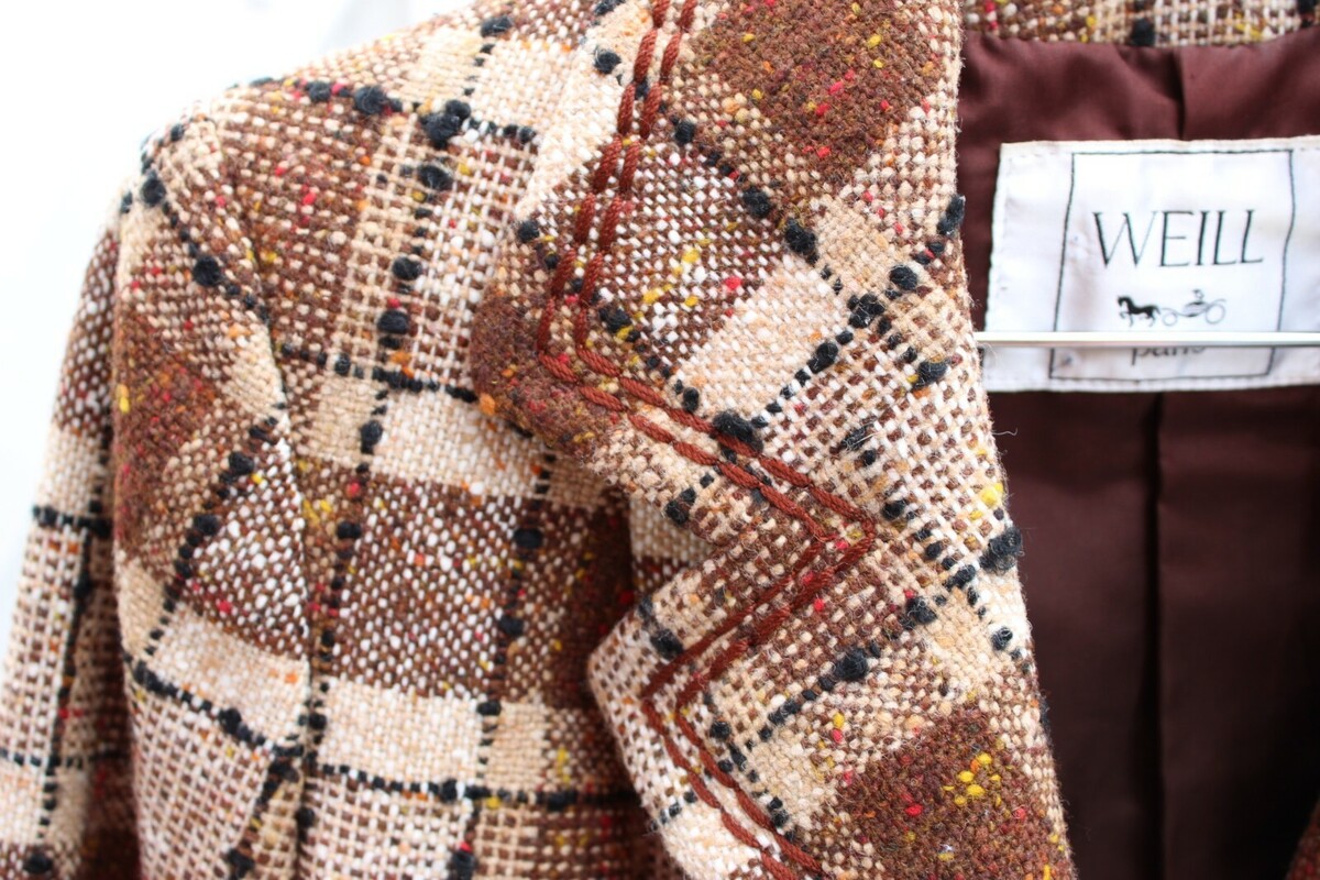 Founded in 1892, Weill Paris is among France?s oldest ready-to-wear houses, renowned for refined tailoring and fabrics. By the mid-20th century, the label specialized in high-quality suits and coats for women, selling at premium price points. This example demonstrates that tradition with its tweed weave, careful finishing, and flattering cut.