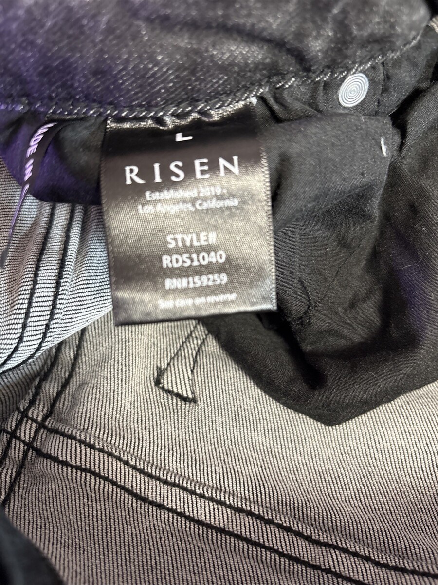 The Risen Women's Black Stretch Pockets Distressed Denim Cut-Off Shorts in size Large are a stylish and comfortable addition to any casual wardrobe. Made from a cotton blend denim fabric with a dark wash, these shorts feature a flat front design with a button closure and a 5-pocket design for added convenience. Perfect for the spring season, these shorts are designed for comfort with a stretch fit, making them ideal for various activities, especially beach outings. The distressed detail adds a touch of edgy flair, while the black color gives them a versatile and chic look that can be machine washed for easy care.