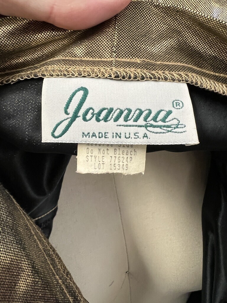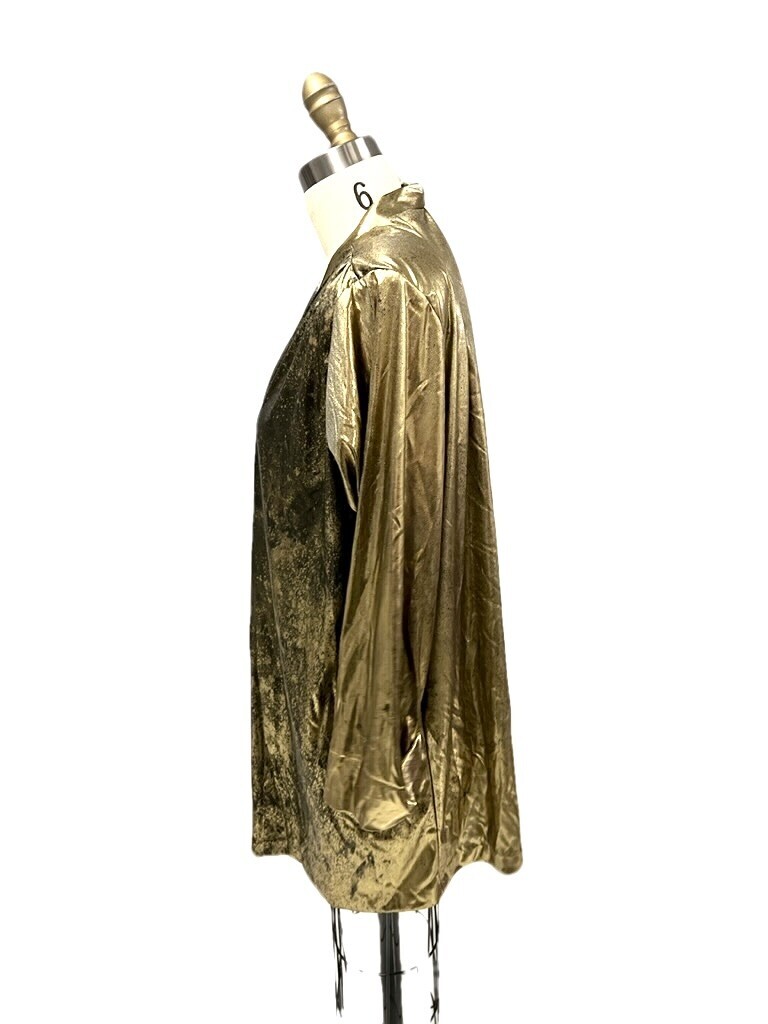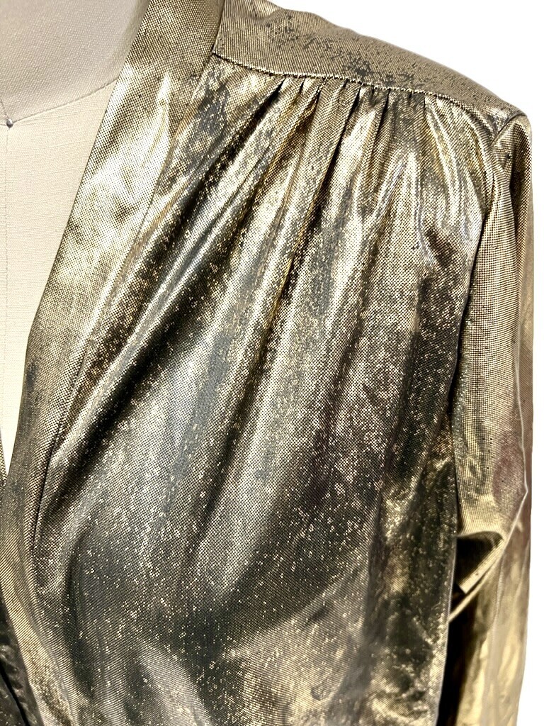 Get ready to shine like the rockstar you were always meant to be in this fabulous Vintage 80s Joanna Liquid Gold Jacket! This open-front stunner is pure 80s glam, dripping in a gorgeous antique gold that's rich with character (those "discolorations"? They're part of the magic!).