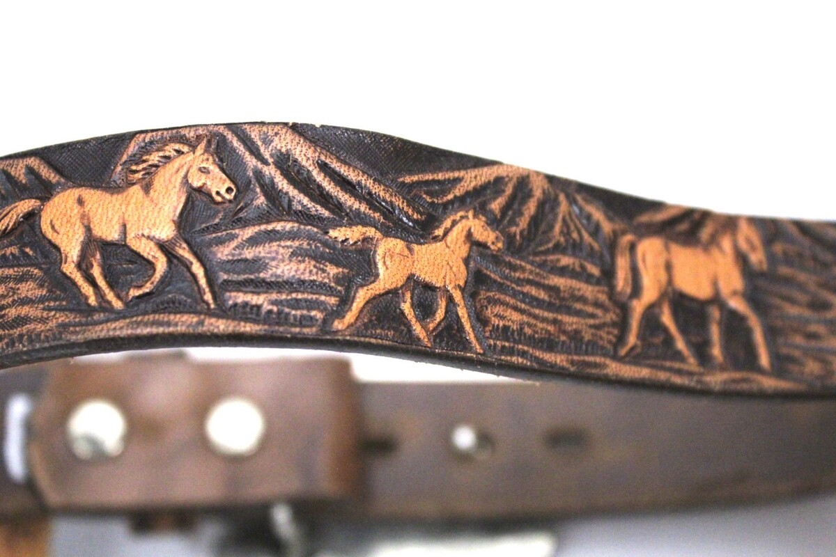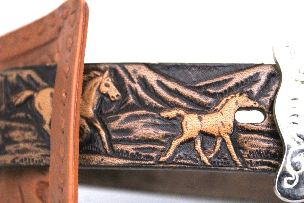 Kids VTG Tolled Leather WRANGLER Holster Belt Western Silver Buckle Horse 24"