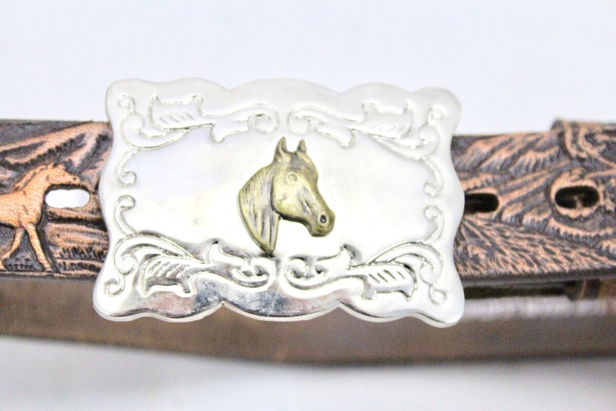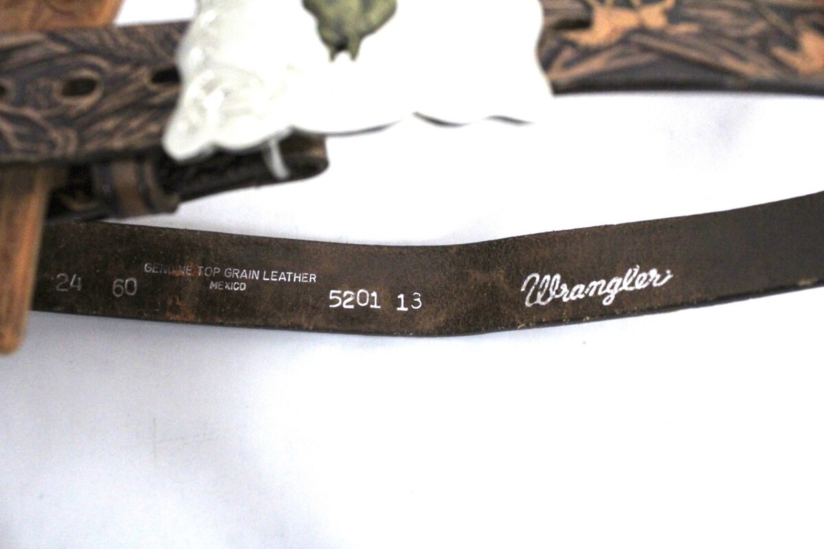 WRANGLER Tooled Leather Belt Rodeo VTG Western Silver Buckle Horses Trees 24" Holsters; The vintage Wrangler leather belt probably didn't have the holsters on it originally, but this is how I found it. The Holsters are plastic, but heavy. The large buckle is stainless steel with a brass horse head. The holsters are 9" long. They have acorns tooled onto them. All of it is in great condition, and clean. Belt is 1" wide.