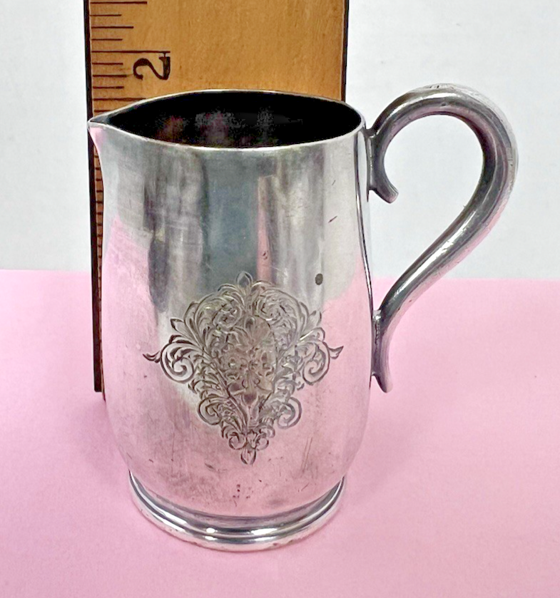 Tiny Silver Jug Pitcher w Hallmarks Scroll Floral Design 2 Inch Sweet there is a super tiny dent on the back side also a few faint marks or lines . 2 inches tall to top of the handle its not in Perfect shape but its so tiny and sweet