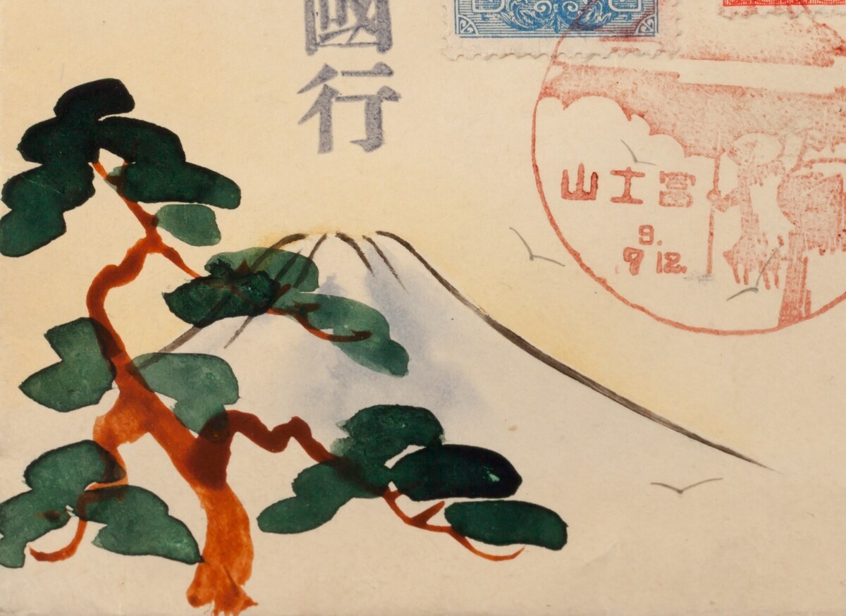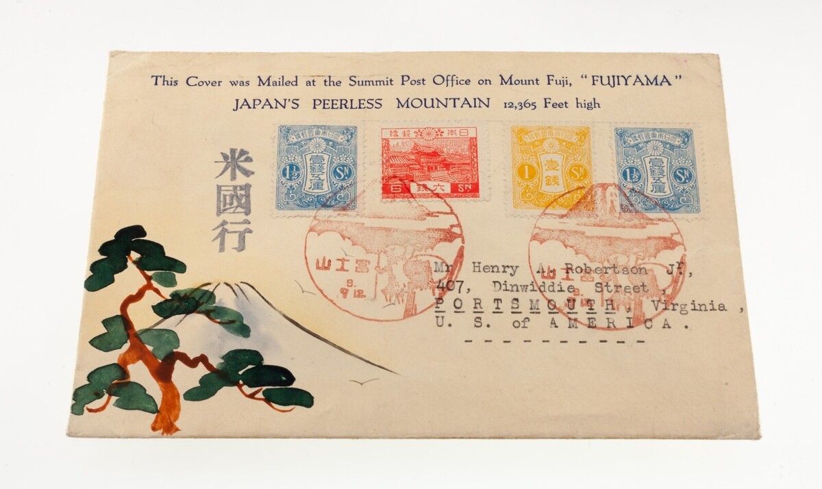 Cette couverture a ete envoyee au bureau de poste du sommet sur le mont Fuji, "FUJIYAMA" JAPAN'S PEERLESS MOUNTAIN 12,365 Feet high