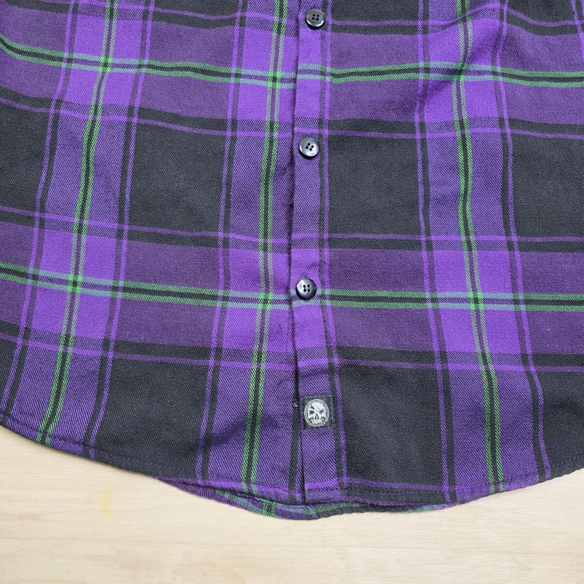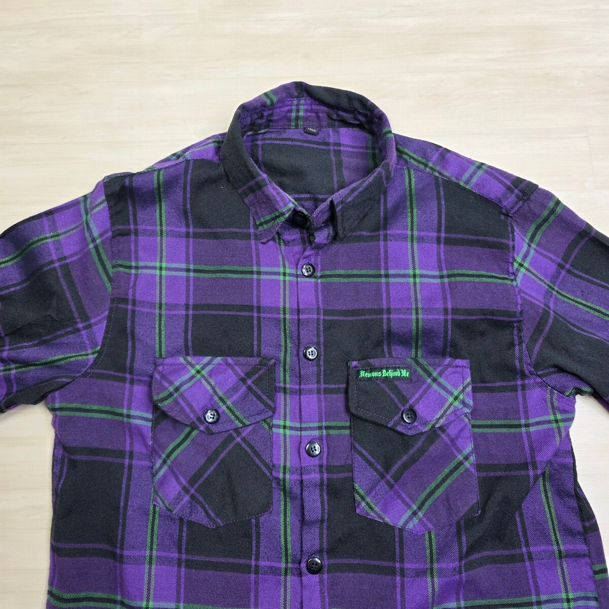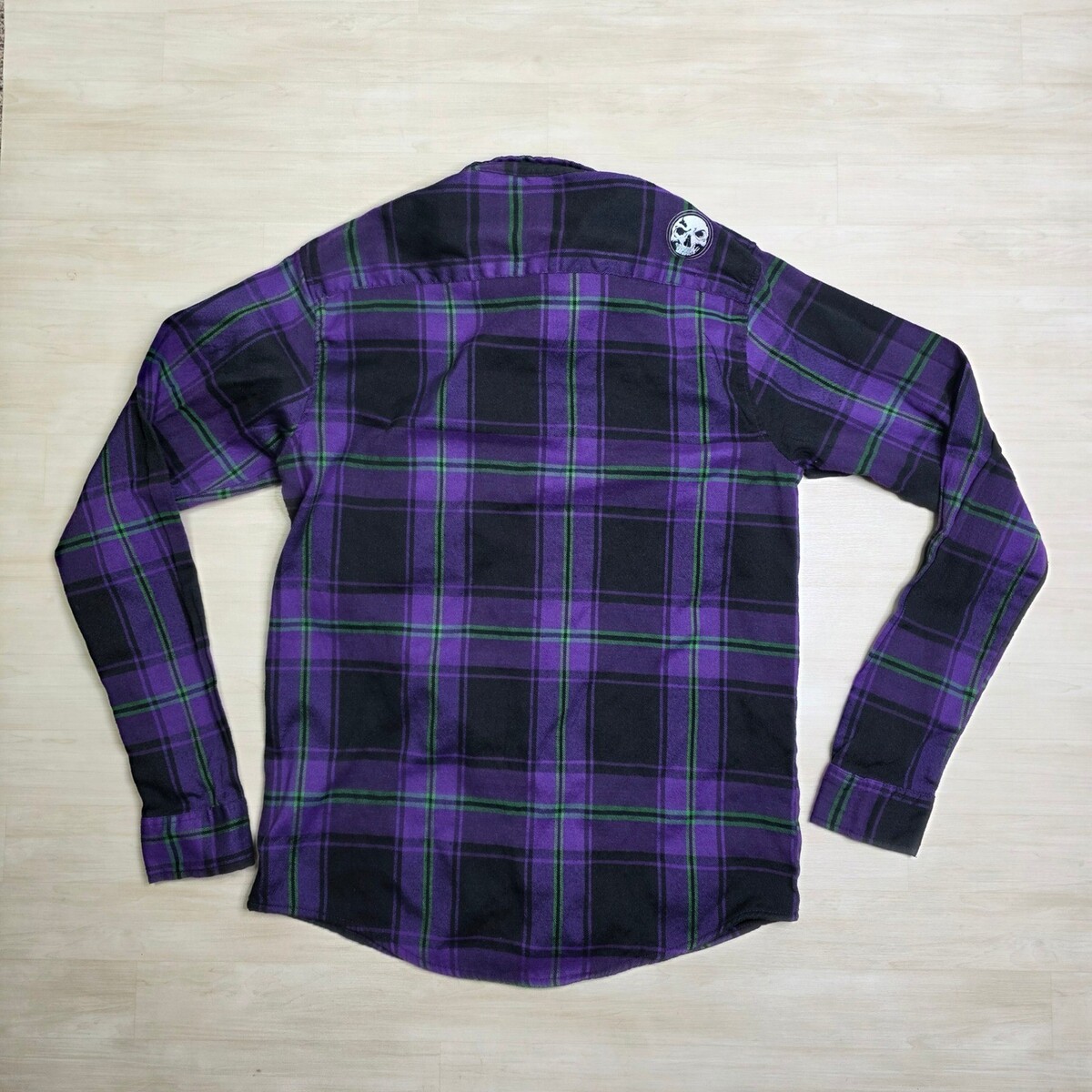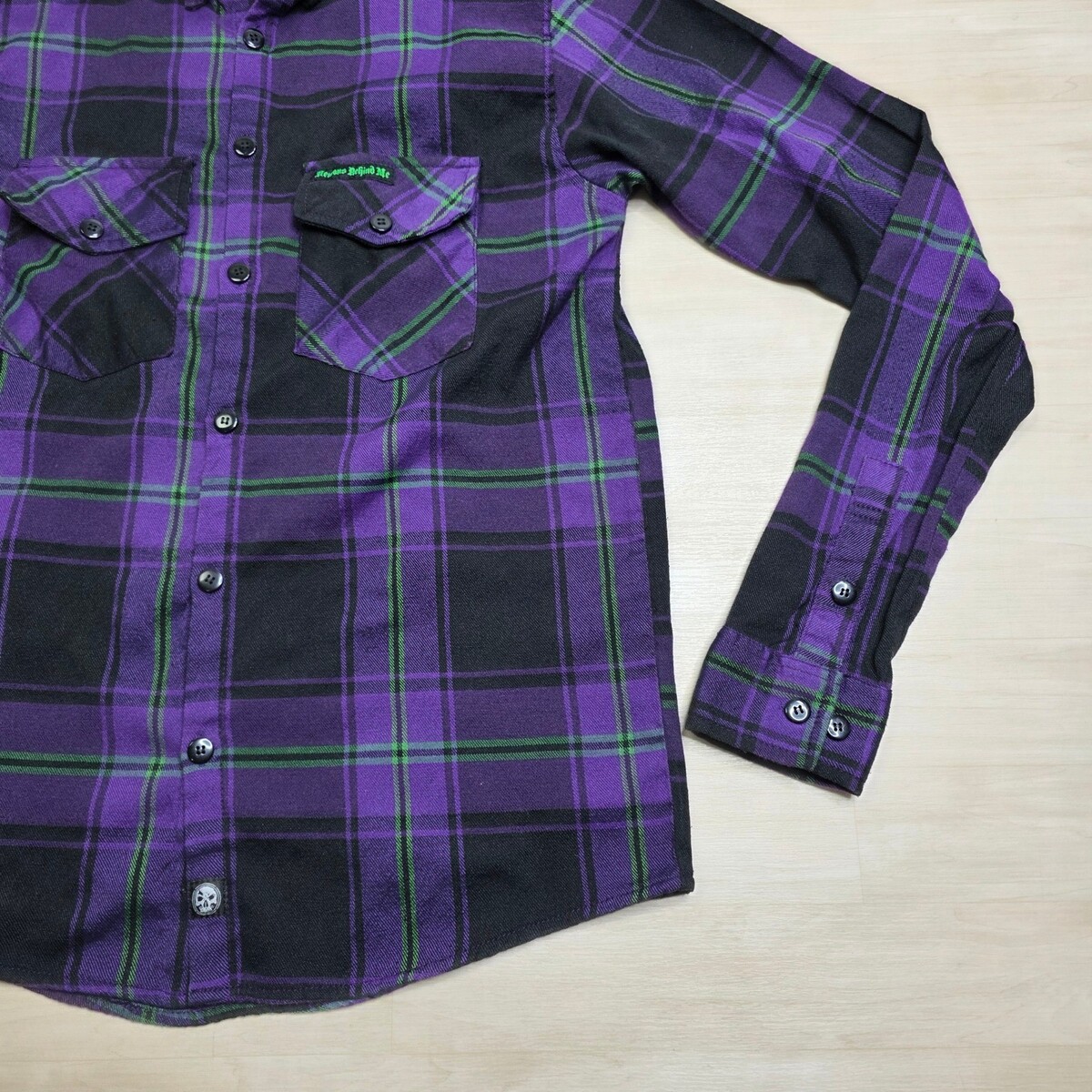 Demons Behind Me Purple Black Green Plaid Flannel Shirt Skull Patch