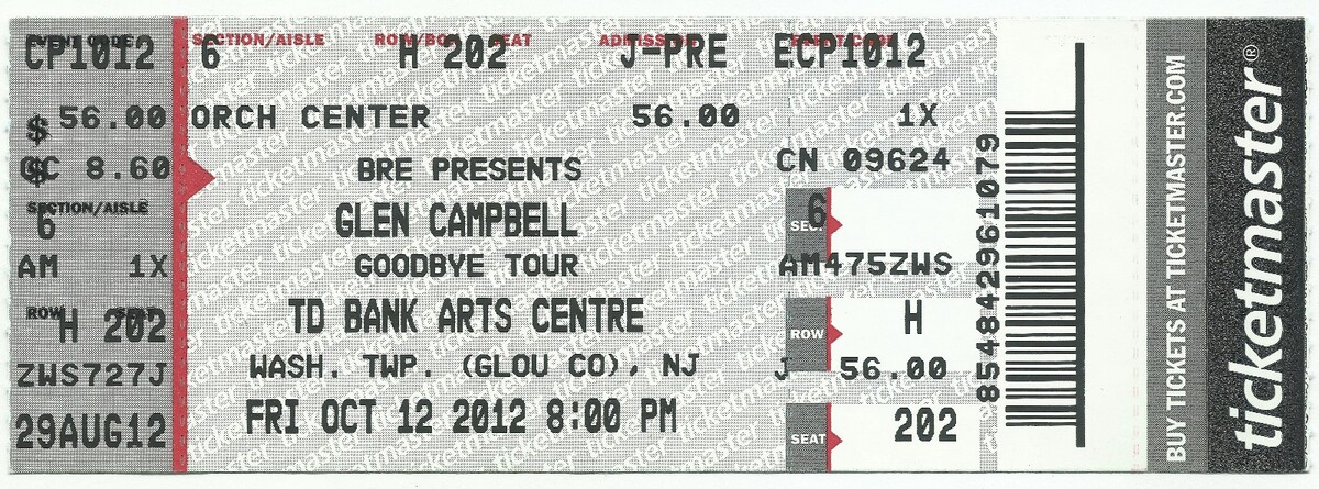 Glen Campbell Unused Concert Ticket Goodbye Tour Glou Twp NJ August 29 2012