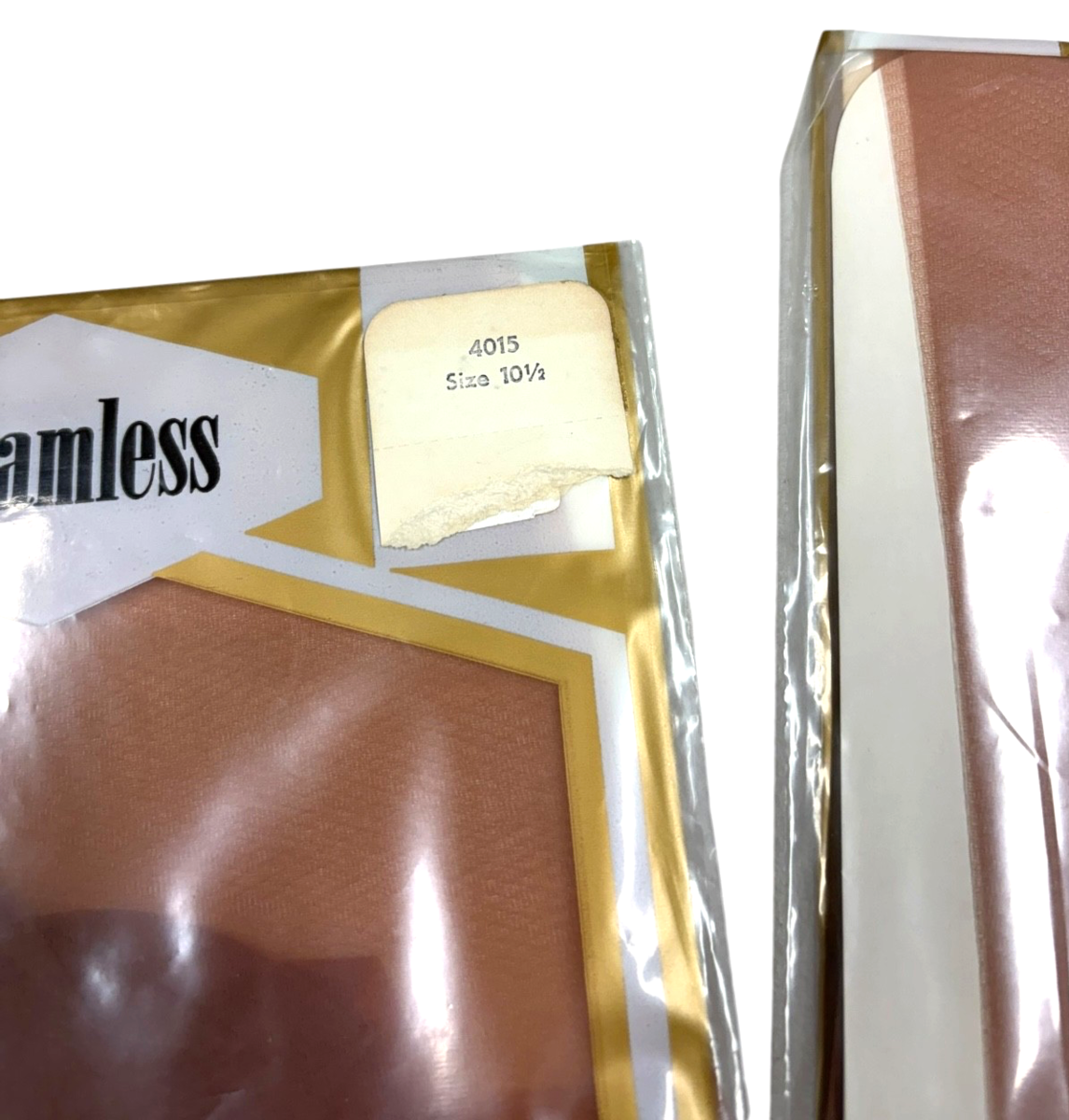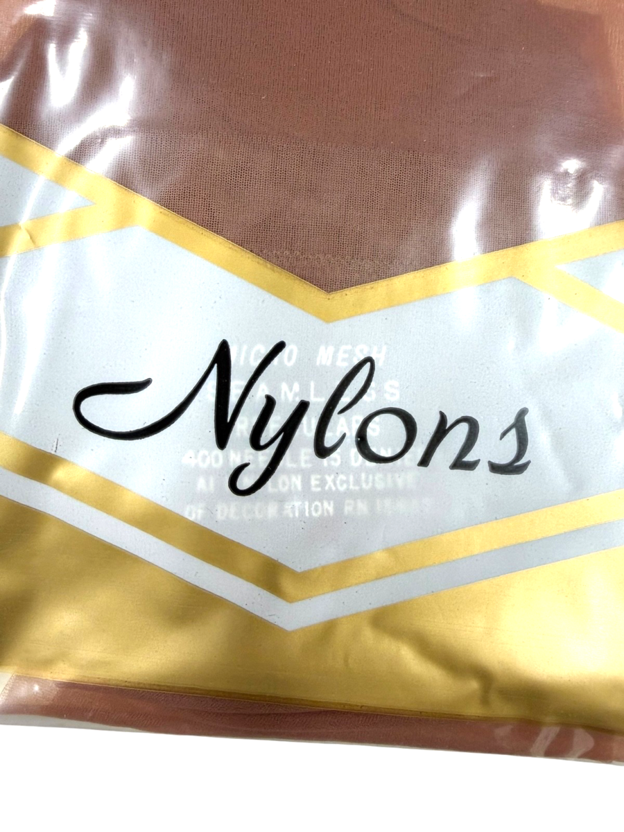 2 Pairs of Vintage Seamless Micro Mesh Nylon Stockings Size 10.5. Still in the original packaging. The stamping on the nylons says "Micro Mesh, Seamless, Irregulars, 400 Needle 15 Denier, All Nylon Exclusive of Decoration, RN 15617." Please note that the color is not as dark as it appears in the photos.