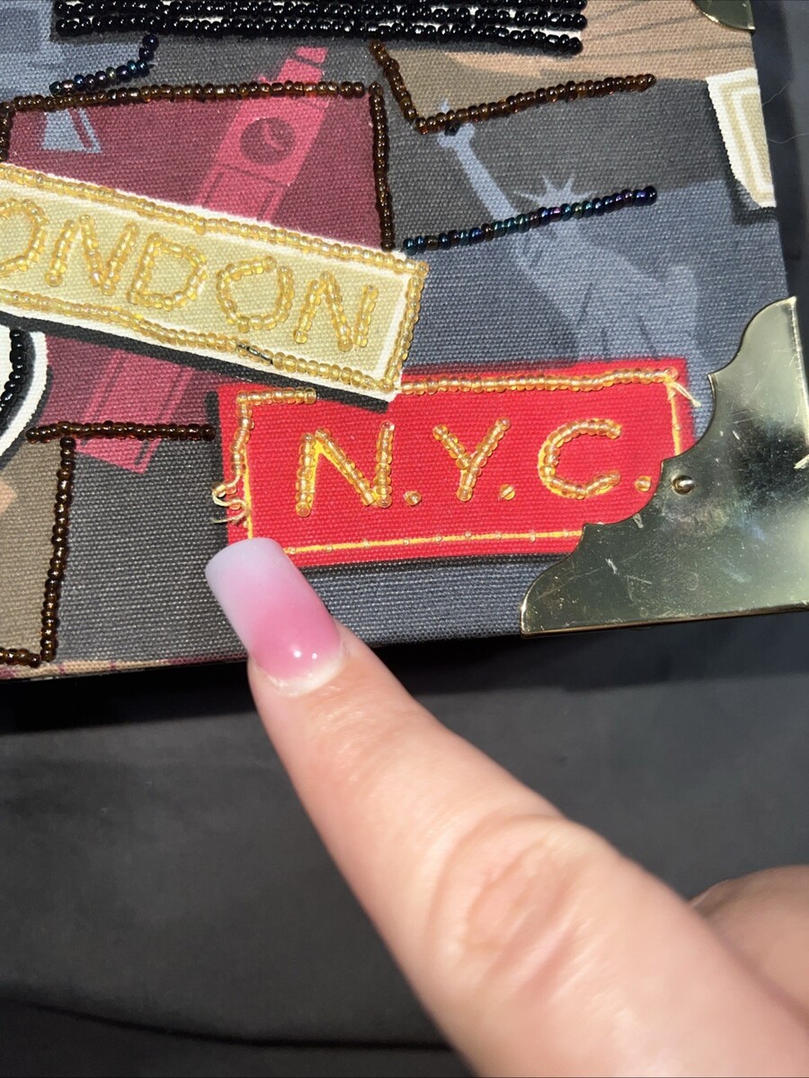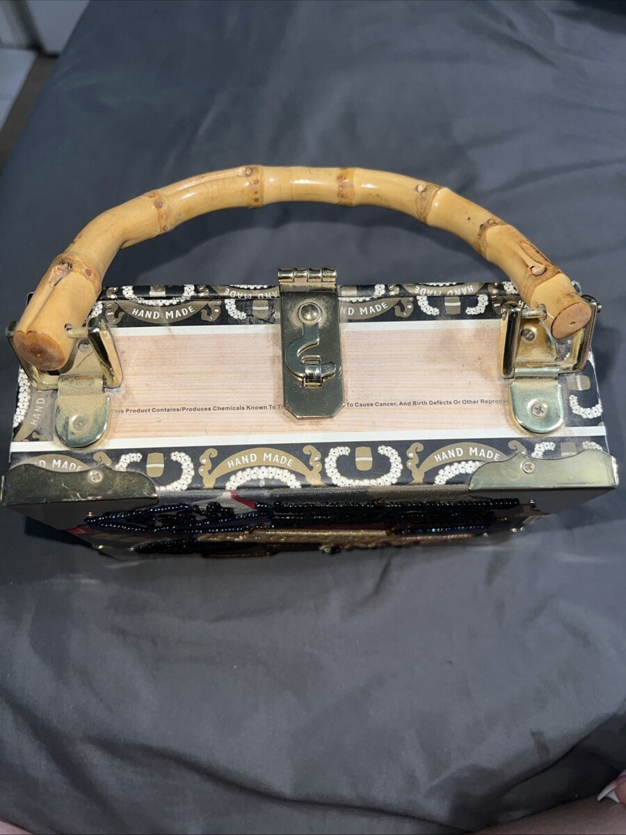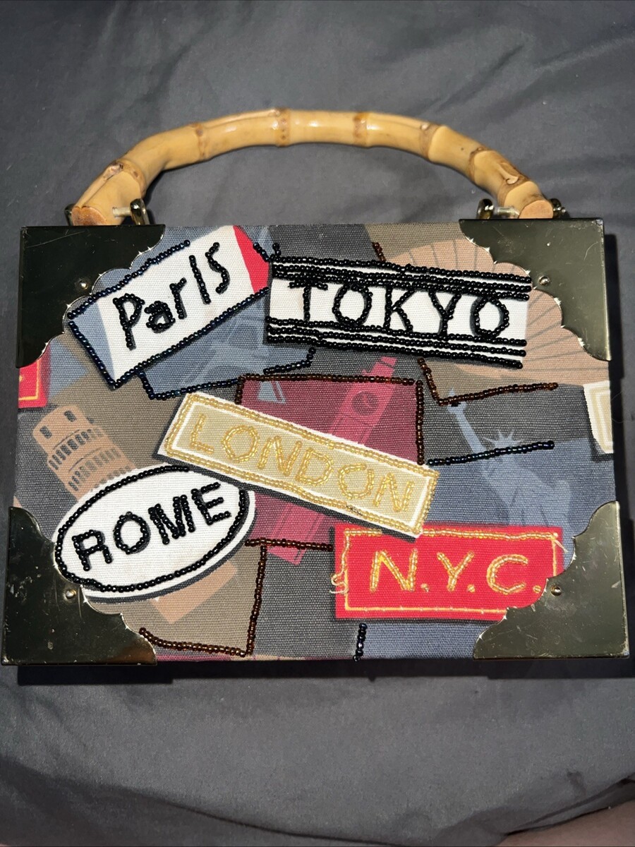 Romeo Roma Cigar Box Purse Bamboo Handle Beaded, Paris, Tokyo, London, NYC, Rome