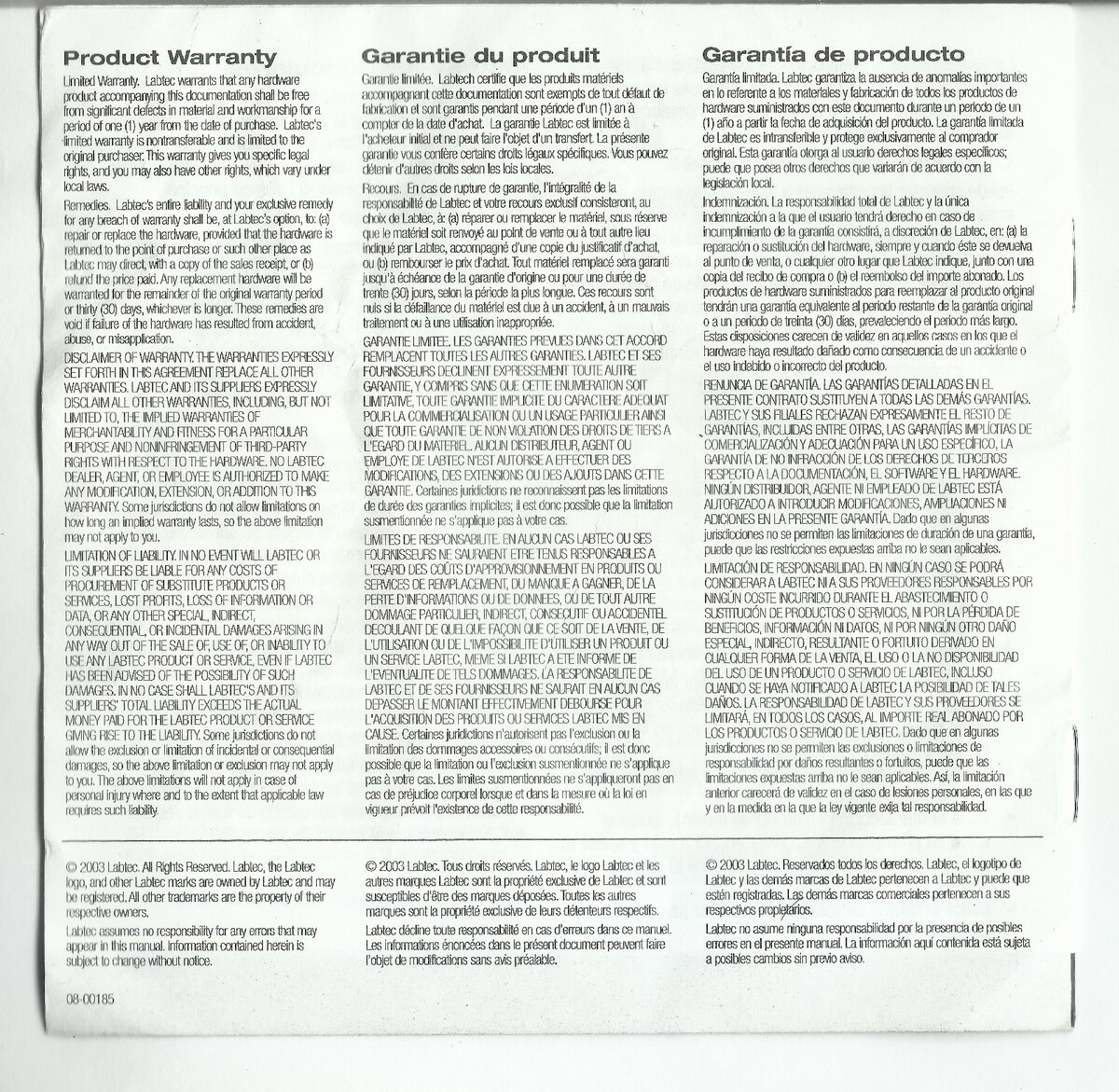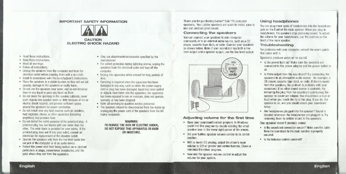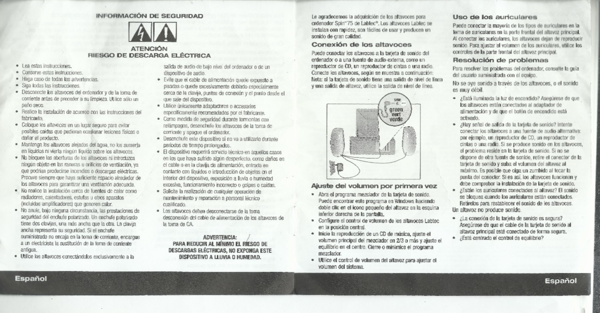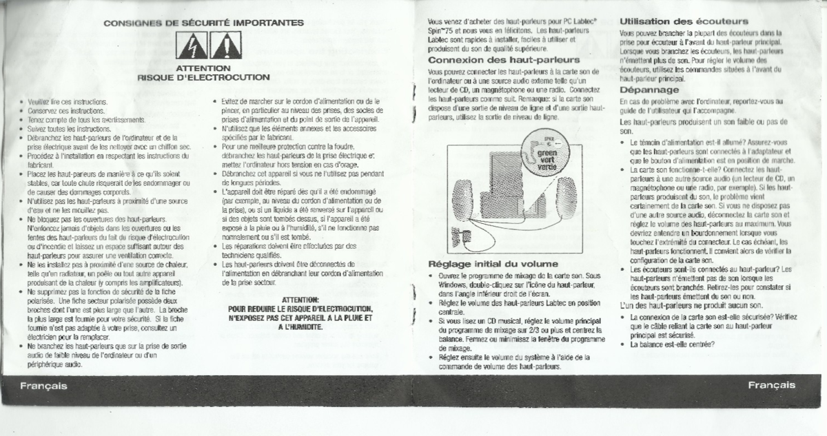 Labtec Spin 75 Printed Owners Manual speakers 2 pages english 2 french 2 spanish