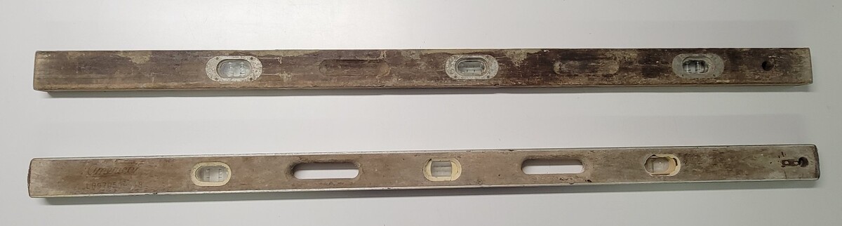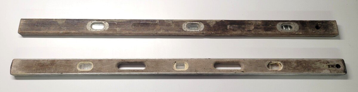 Levels are in rough vintage used condition with significant signs of masonry use, age and years of garage storage. Levels have some broken glass, missing end caps, scuffs, marks and dirt.