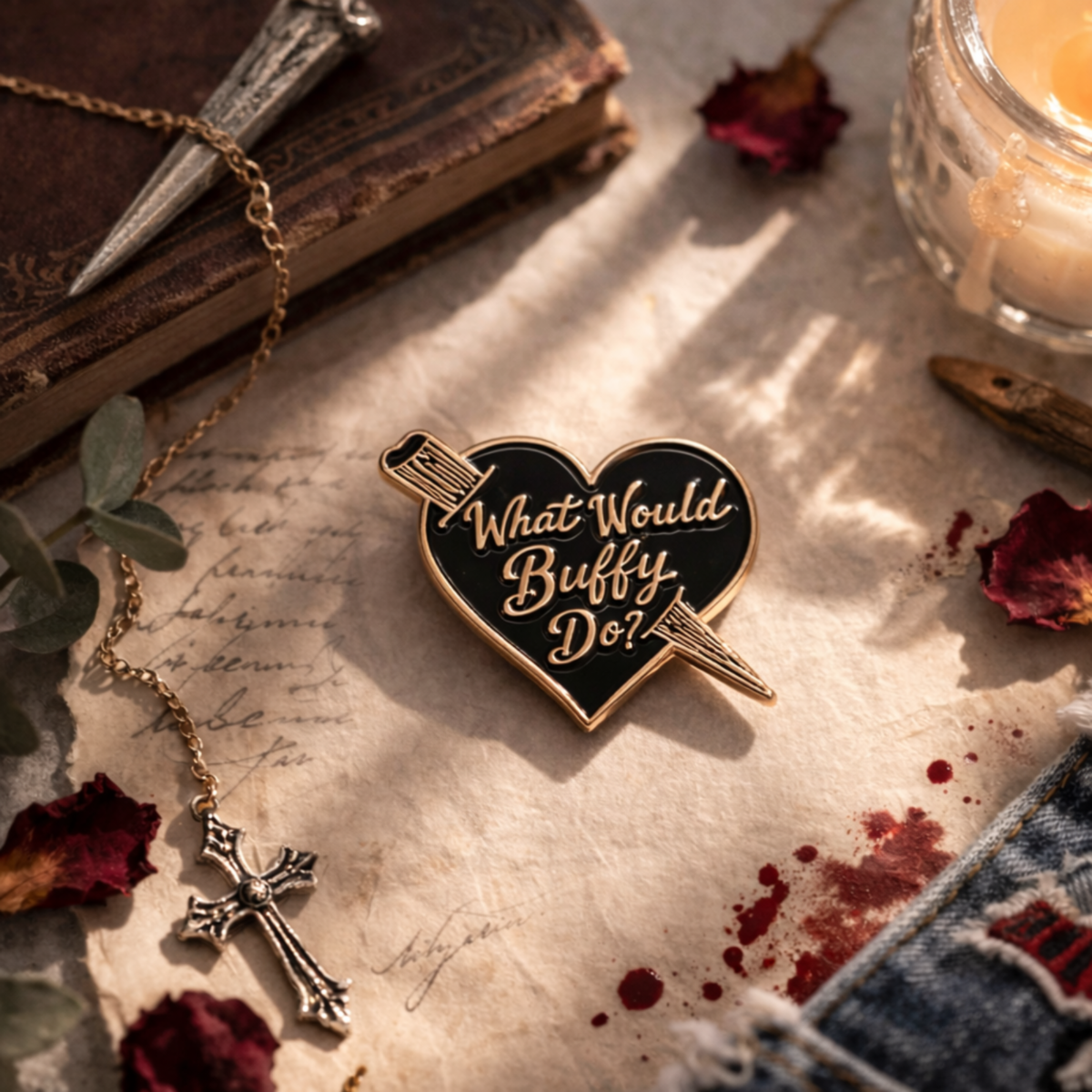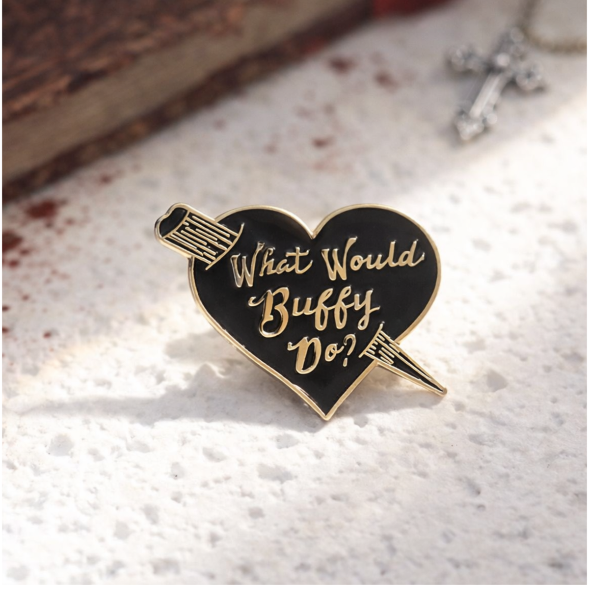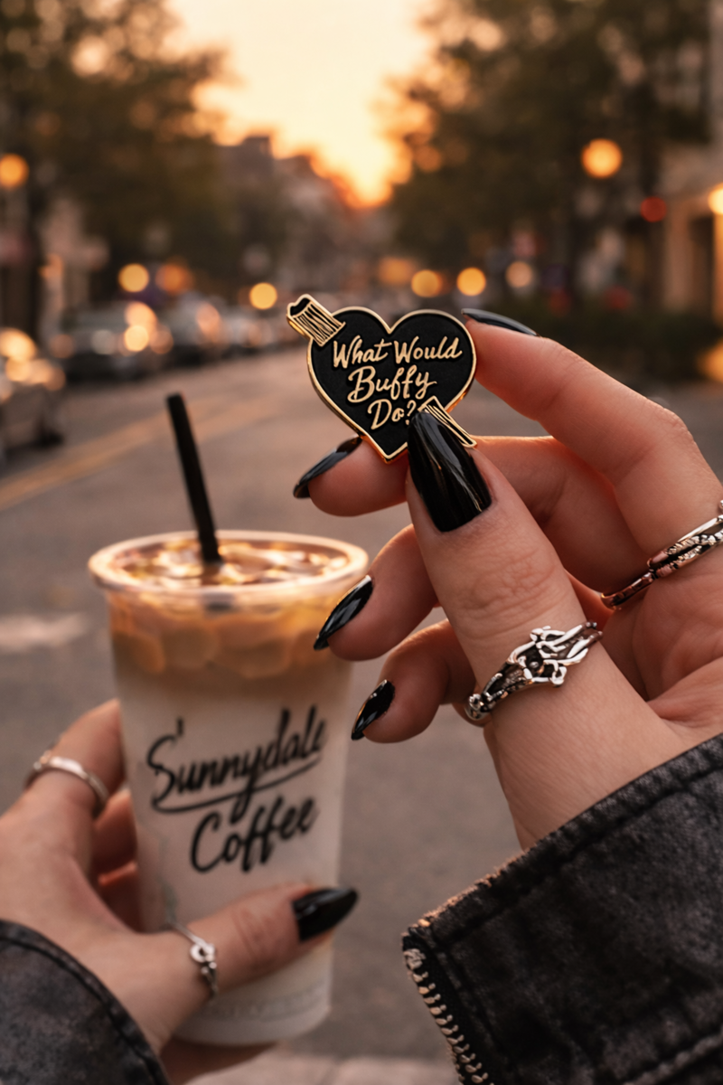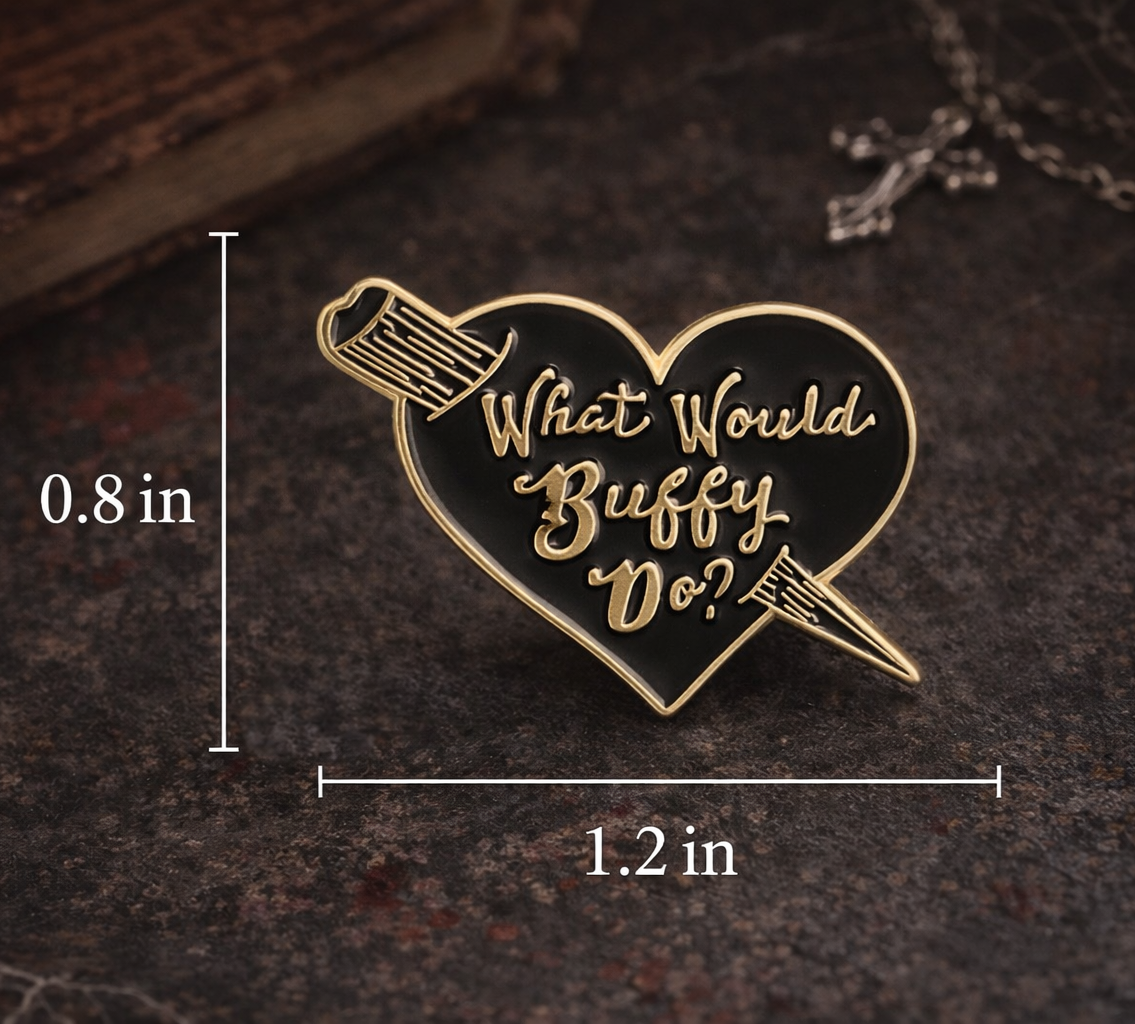 Channel your inner Slayer with this iconic ?What Would Buffy Do?? heart-shaped enamel pin ? the perfect accessory for fans of Buffy the Vampire Slayer 90s nostalgia, soft-goth vibes, and anyone who loves a good quip before saving the world. ?