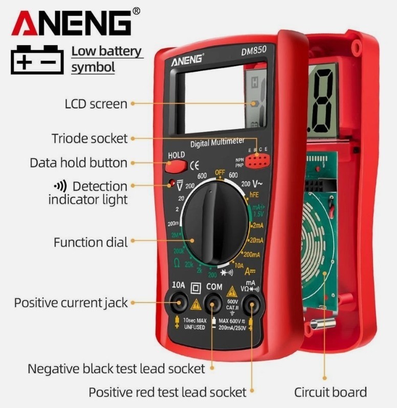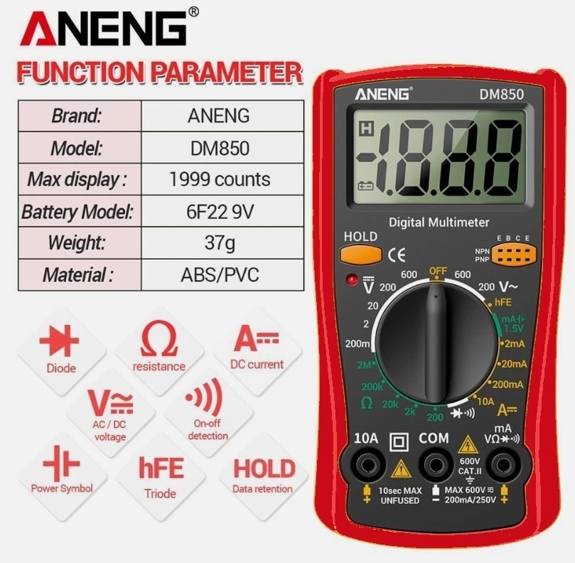 Digital Display :The digital display on the ANENG DM850 1999 Counts Digital Multimeter provides accurate and easy-to-read results, making it a reliable tool for any electrician.