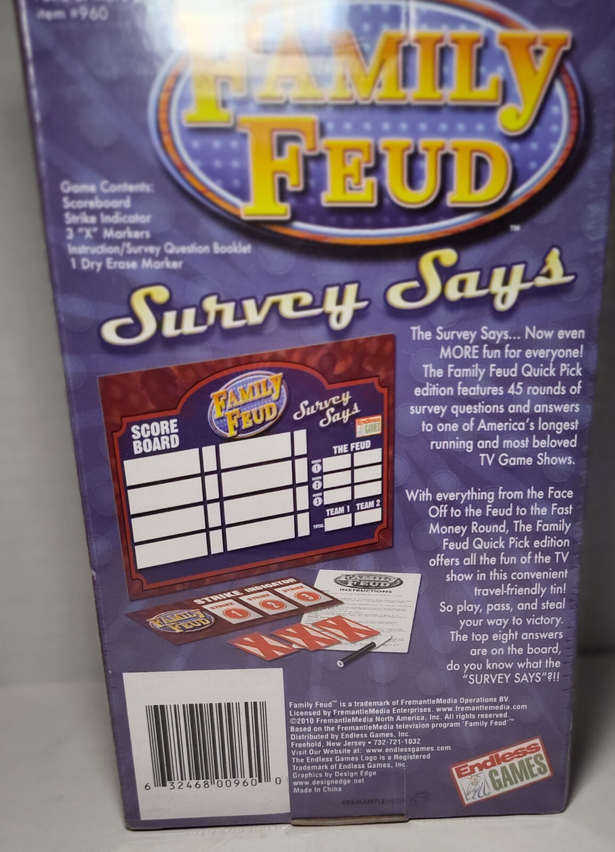 Quick Picks ?Family Feud Survey Says? travel-size game, based on the popular TV game show Family Feud.