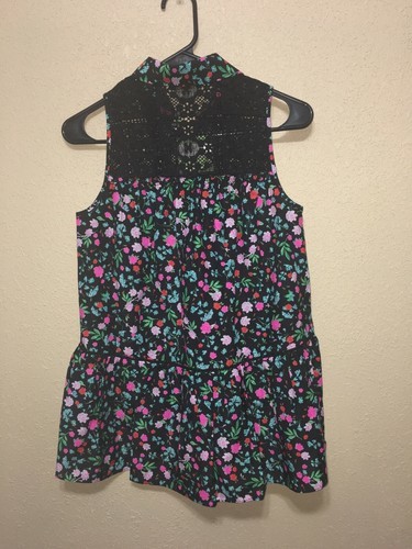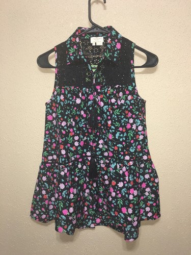 Fresh floral top touched with lace. Spread collar with self-tie detail. Sleeveless. Tonal topstitching and panel seaming.