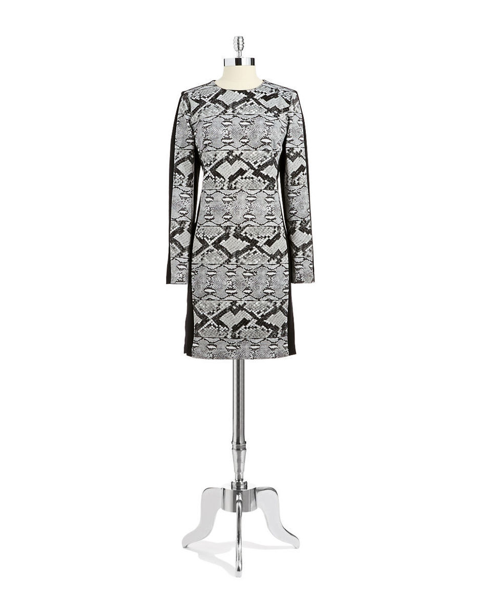 Boasting a scoop neckline, back zip closure and long sleeves, this chic dress is perfect with bright heels for a professional look. Scoop neckline long sleeves snakeskin print ponte back zip closure approximate measurement from shoulder to hem for size 6: 35" polyester/spandex/nylon machine wash imported.