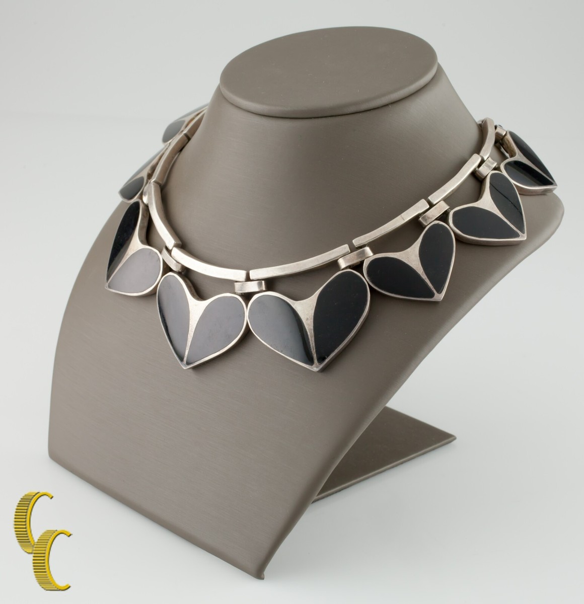 Taxco Mexico Sterling Silver Onyx Inlay Heart Dangle Choker Necklace