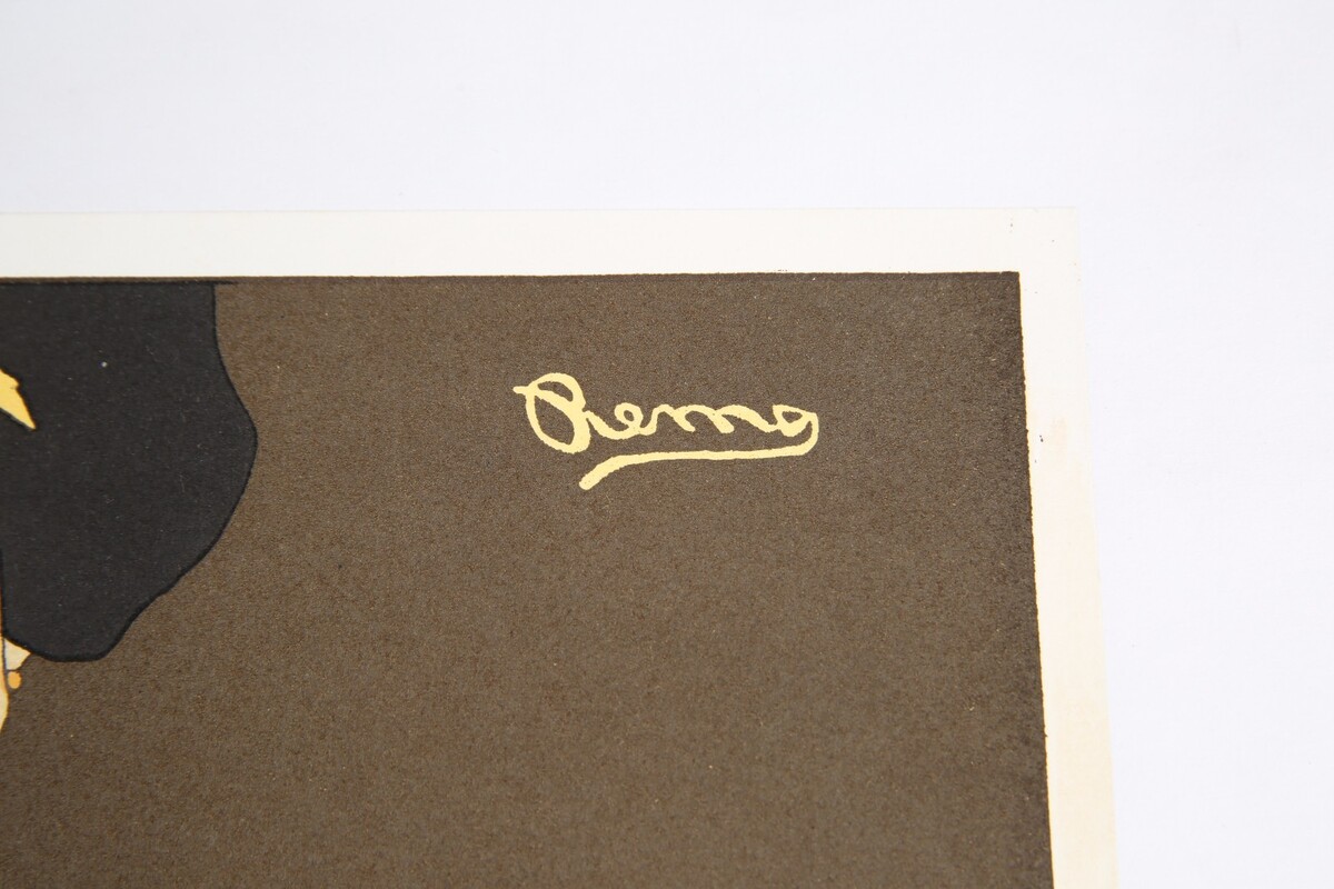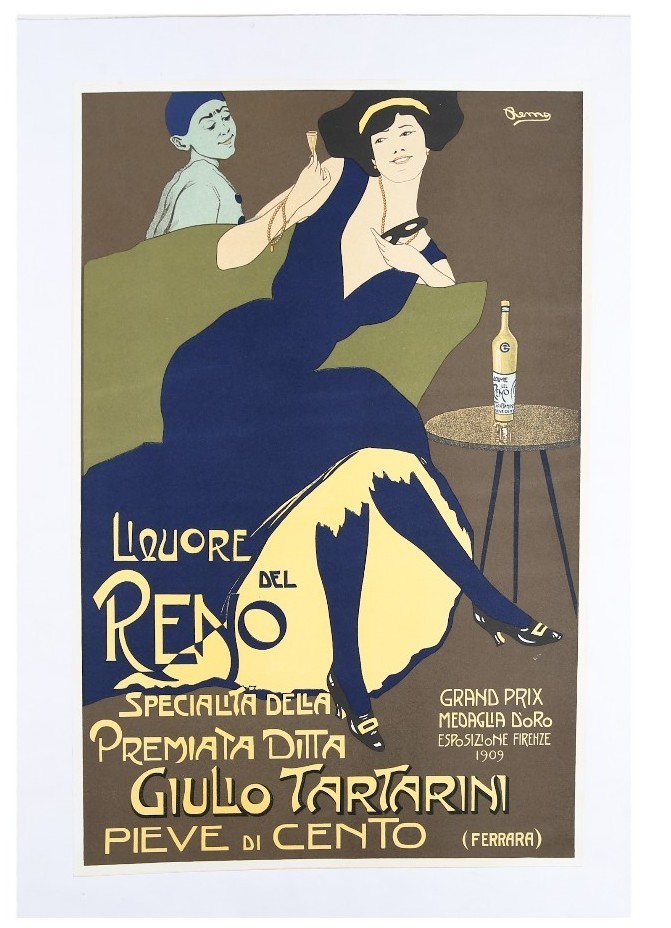 Hermosa litografía de un cartel publicitario "Liquore del Reno, 1909" del postimpresionista Remo Branca