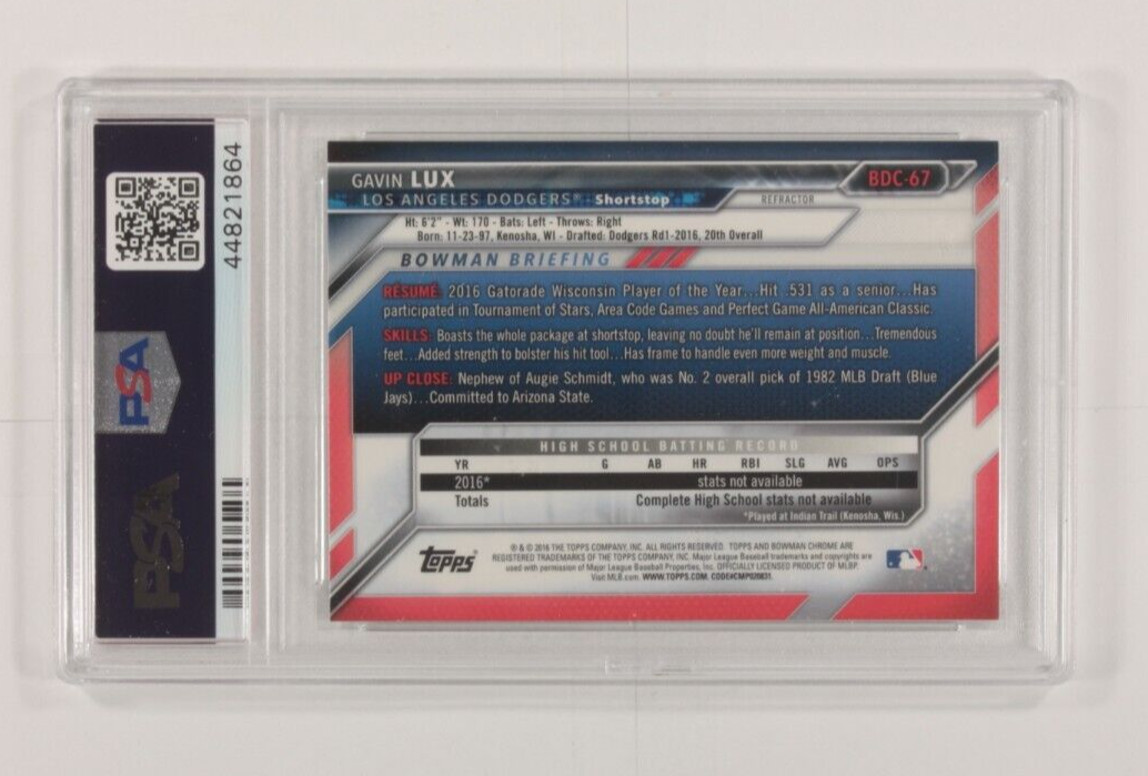 2016 Bowman Draft Gavin Lux Chrome - rifrattori PSA 10 gem Mint Grade #BDC -67