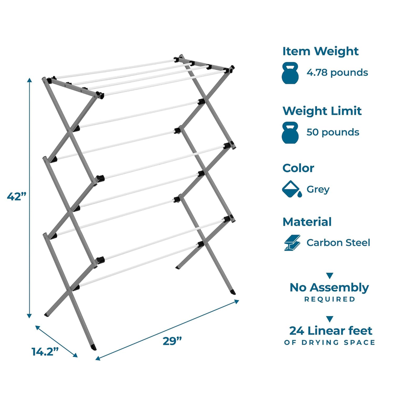 Generous Drying Space for Everyday Laundry ? With 24 linear feet of drying room, this laundry drying rack provides ample space to air-dry clothing, towels, a must-have laundry accessories.