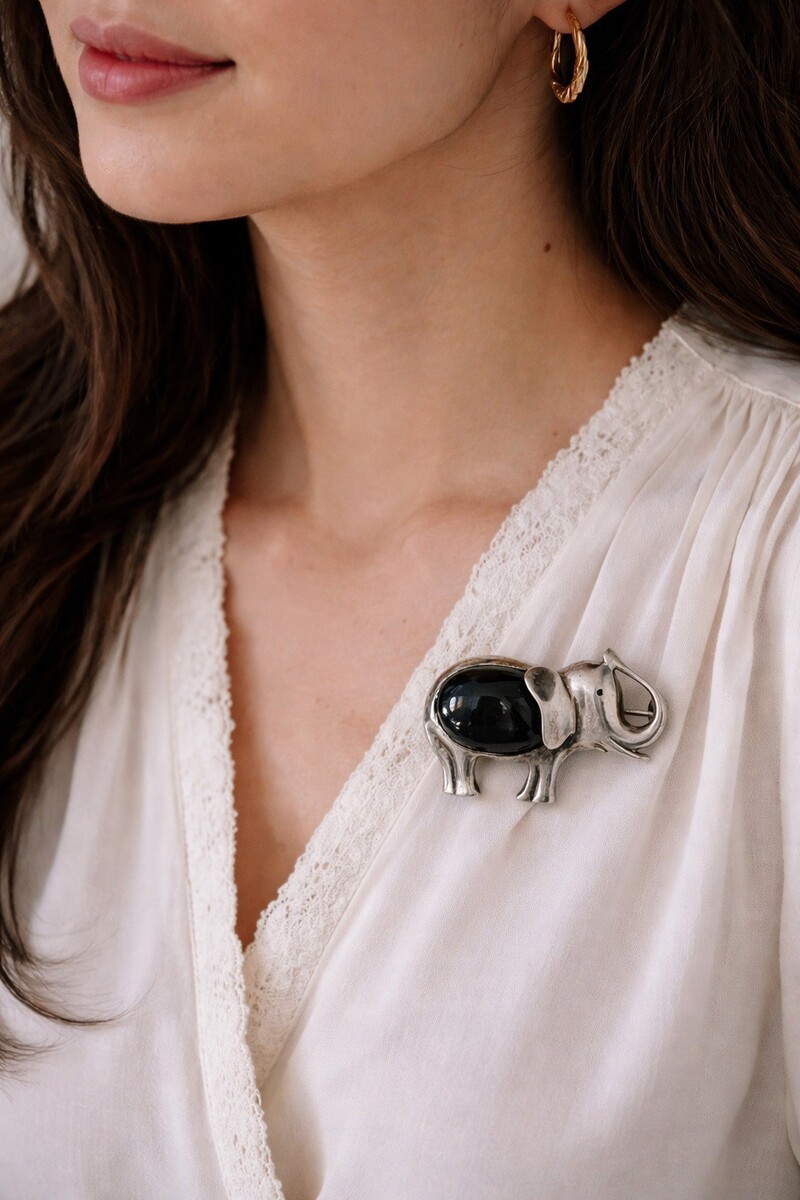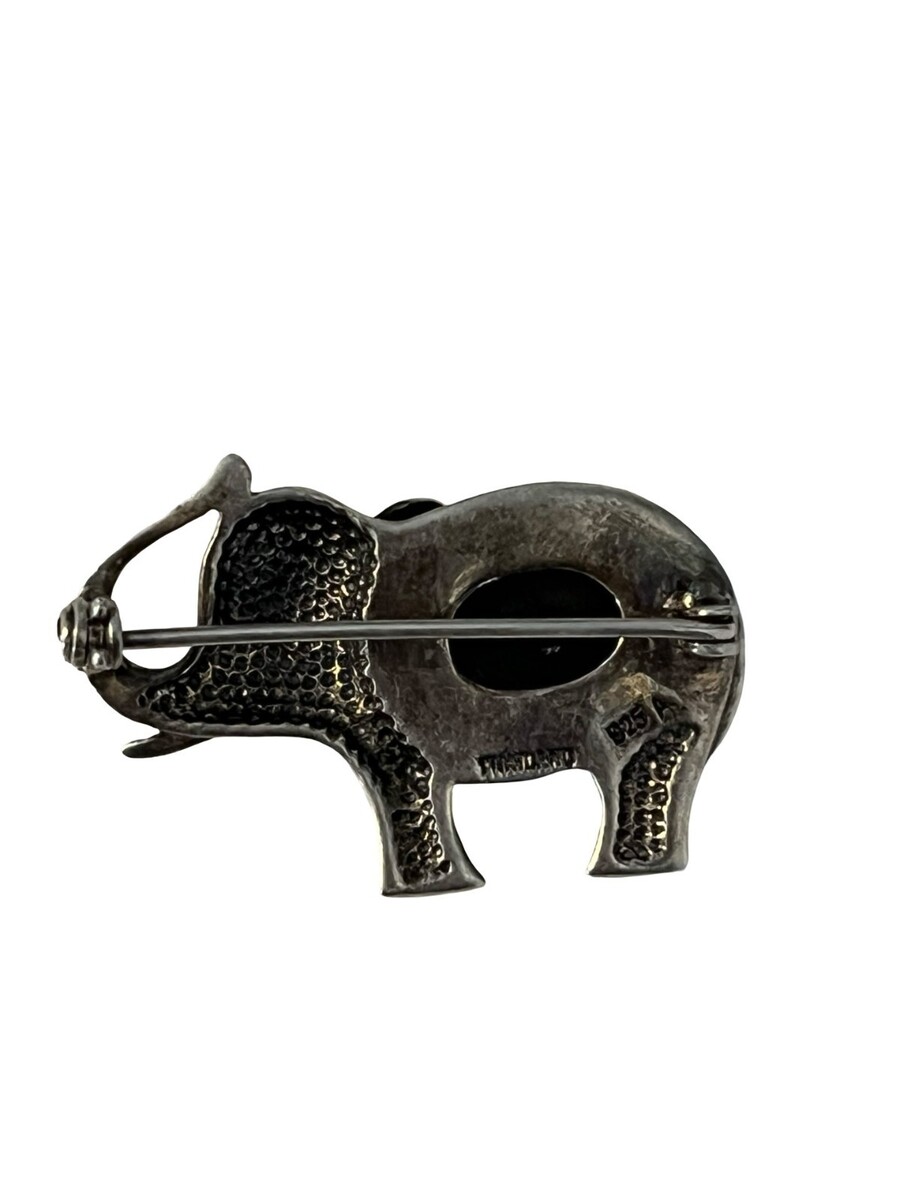 Beautiful vintage sterling silver elephant brooch featuring a bold black onyx inlay. Crafted in Mexico, this piece showcases a stylized elephant design with a smooth, polished stone body and textured silver detailing. The contrast between the deep black stone and aged silver gives it a strong, eye-catching look. A great collectible piece with both artisan character and classic symbolism.