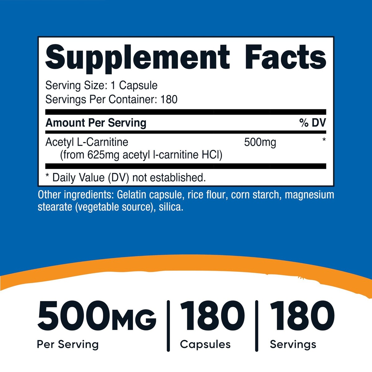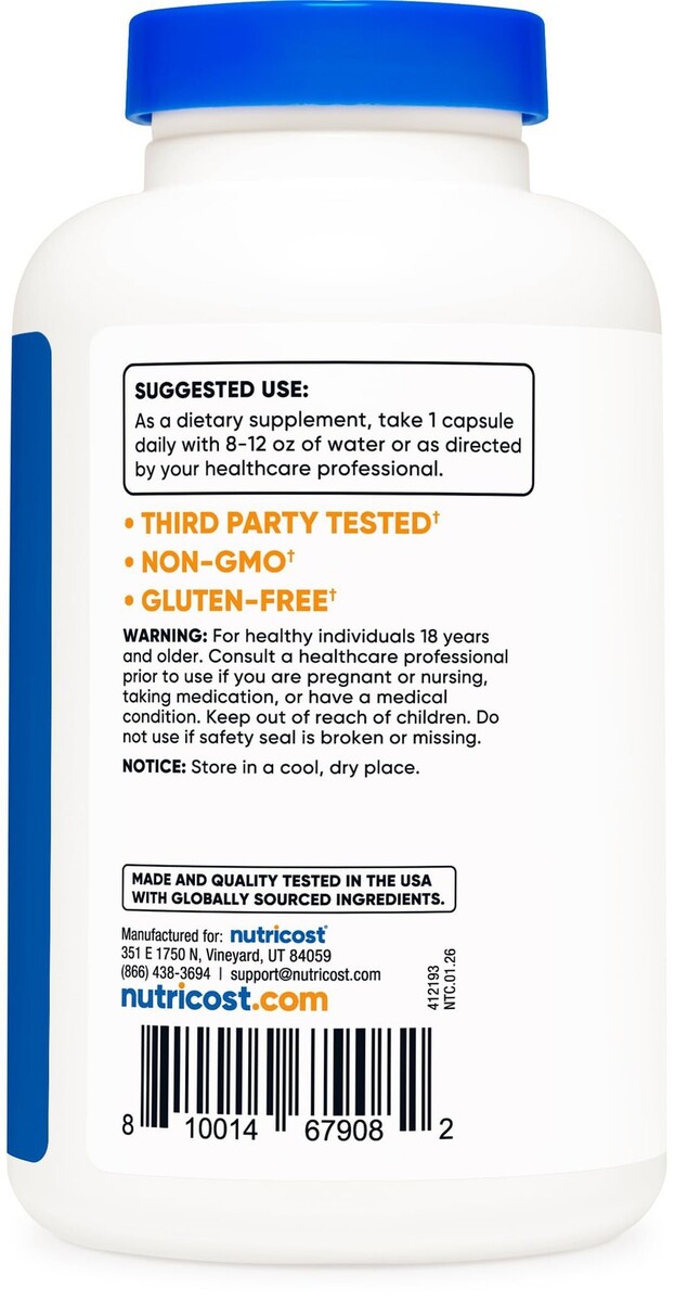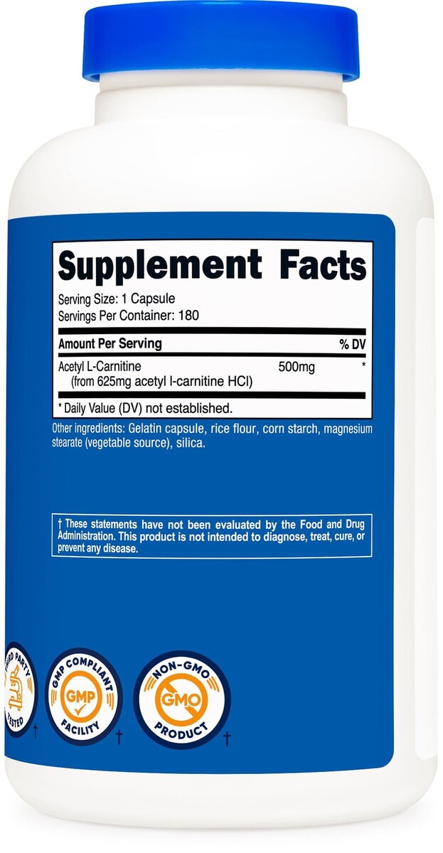 Expiration Date of 7/2027 ? Acetyl L-Carnitine (ALCAR): Each capsule contains 500mg of Acetyl L-Carnitine (ALCAR) ? 180 capsules per bottle: With 180 capsules in each bottle, you have a generous supply of Acetyl L-Carnitine to last you for an extended period, allowing for consistent usage if taken as suggested. ? Convenient daily serving: With a recommended serving size of just one capsule per day (180 Servings Per Bottle), Nutricost Acetyl L-Carnitine is easy to incorporate into your daily routine. ? Quality Manufacturing: Nutricost Acetyl L-Carnitine is manufactured in an NSF certified, GMP Compliant Facility, ensuring the highest standards of quality and purity. ? Independent Testing: To guarantee the integrity of our product, each batch of Nutricost Acetyl L-Carnitine undergoes independent testing in third-party ISO accredited laboratories.