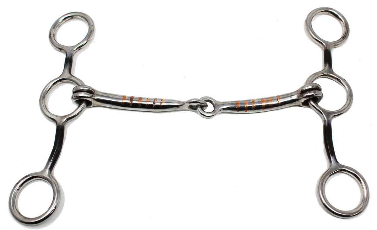 Professional Equine stainless steel smooth snaffle gag bit with copper inlay. Copper rollers on mouthpiece promotes the production of saliva and in turn acceptance of the bit. Cheeks measure 6-3/8"