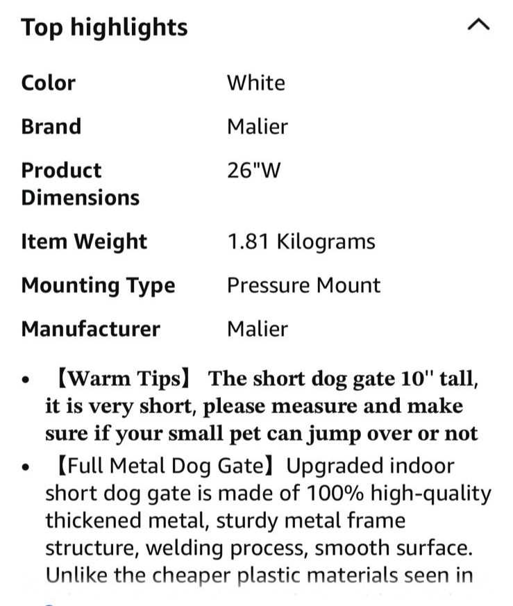 The Dog Gate by Malier is an extra wide and short pet gate specifically designed for dogs. With a small door for easy access, this all-metal gate is sturdy and durable. The gate can be pressure mounted and features a latch closure for secure use. The compact size of 10''H 26''- 41''W makes it ideal for small spaces, and the white color adds a sleek and modern look to any room. This gate is a reliable solution for keeping your pet safe while allowing them to move freely within your home.