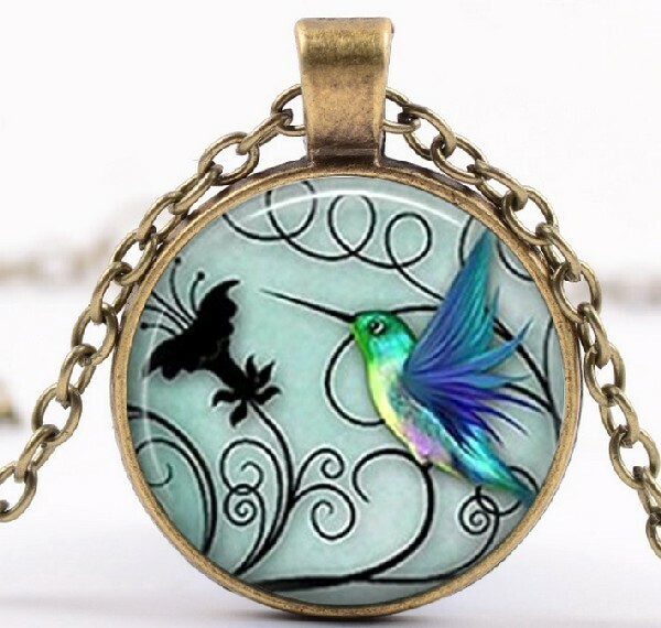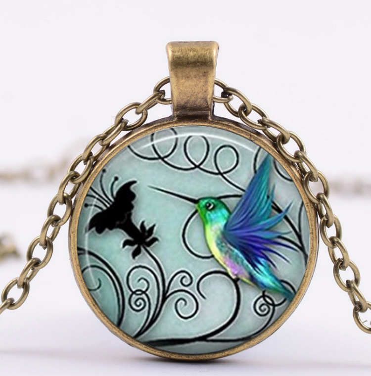 Una capsula redonda con arte de un colibrí con fondo. Como una foto de un colibrí volador en su entorno con Cielo y bosques en el fondo. Una capsula de burbujas de vidrio montado con una base de laton o aluminio. Todo hecho con una cadena de plata de 18 pulgadas. Hermosa escena.